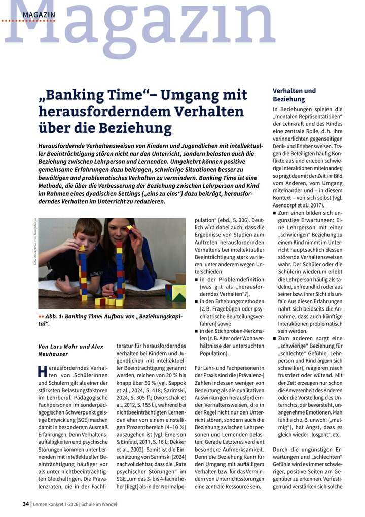Herausfordernde Verhaltensweisen von Kindern und Jugendlichen mit intellektueller Beeinträchtigung stören nicht nur den Unterricht, sondern belasten auch die Beziehung zwischen Lehrperson und Lernenden. Banking Time ist eine Methode, die über die Verbesserung der Beziehung zwischen Lehrperson und Kind im Rahmen eines dyadischen Settings dazu beiträgt, herausforderndes Verhalten im Unterricht zu reduzieren.