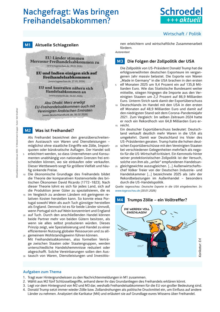Das Arbeitsblatt nimmt das Bemühen der Europäischen Union um mehr Freihandel zum Anlass, um die Grundidee des Freihandels und seine theoretischen Grundlagen zu thematisieren. Behandelt werden auch die Auswirkungen der US-Zollpolitik unter Donald Trump.