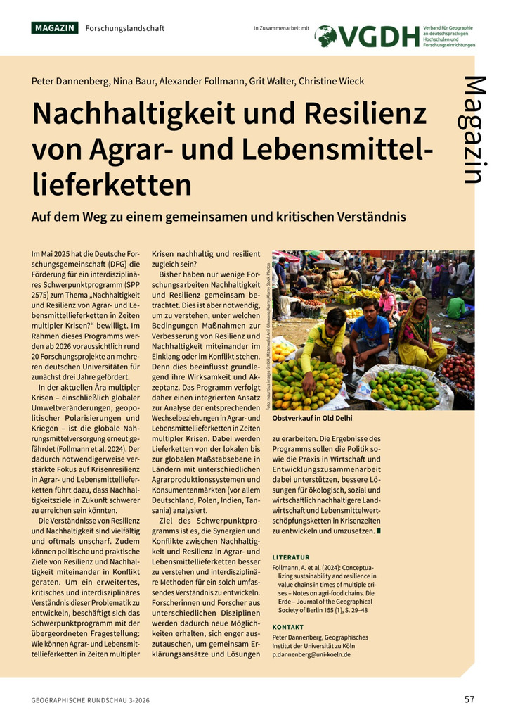 Im Mai 2025 hat die Deutsche Forschungsgemeinschaft (DFG) die Förderung für ein interdisziplinäres Schwerpunktprogramm (SPP 2575) zum Thema „Nachhaltigkeit und Resilienz von Agrar- und Lebensmittellieferketten in Zeiten multipler Krisen?“ bewilligt. Im Rahmen dieses Programms werden ab 2026 voraussichtlich rund 20 Forschungsprojekte an mehreren deutschen Universitäten für zunächst drei Jahre gefördert.