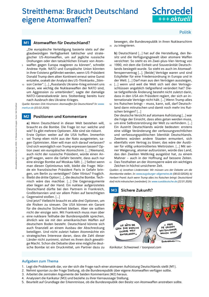 Das Arbeitsblatt informiert über die gewandelte sicherheitspolitische Situation, vor deren Hintergrund die Frage nach einer atomaren Bewaffnung Deutschlands gestellt wird, und ermöglicht anhand zweier Kommentare und einer Karikatur eine Urteilsbildung zu dieser Frage.