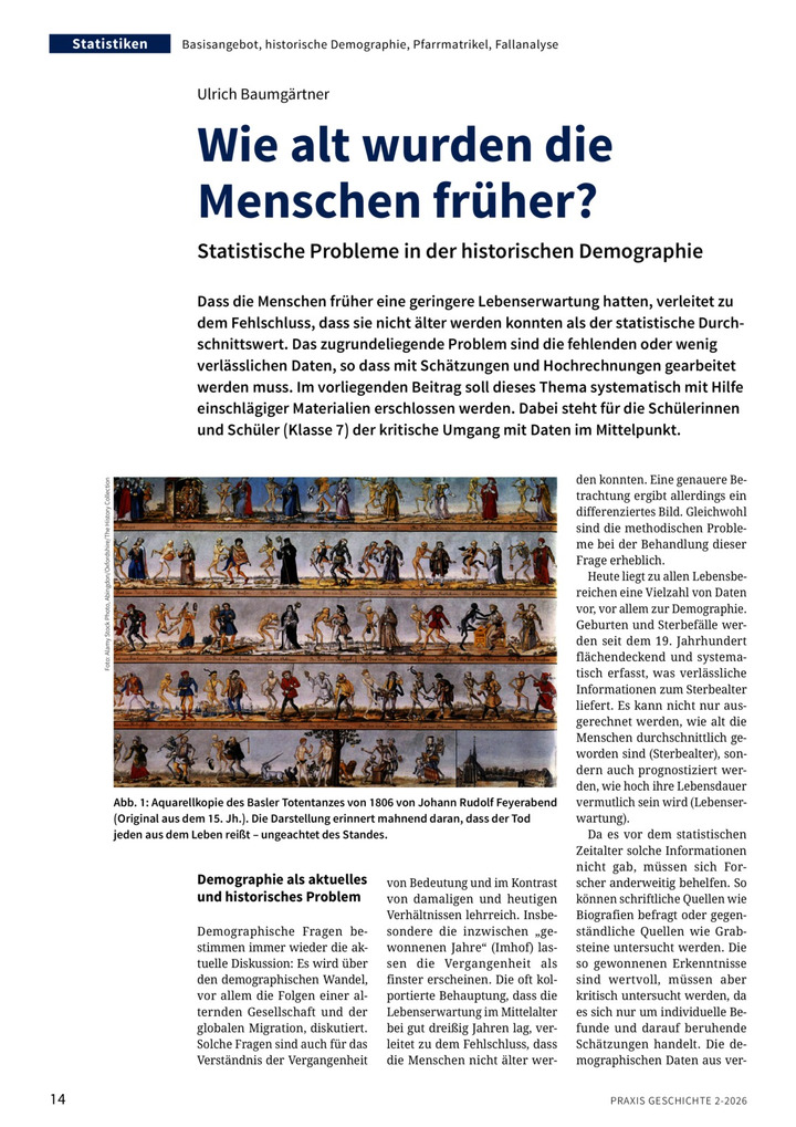Dass die Menschen früher eine geringere Lebenserwartung hatten, verleitet zu dem Fehlschluss, dass sie nicht älter werden konnten als der statistische Durchschnittswert. Das zugrundeliegende Problem sind die fehlenden oder wenig verlässlichen Daten, so dass mit Schätzungen und Hochrechnungen gearbeitet werden muss. Im vorliegenden Beitrag soll dieses Thema systematisch mit Hilfe einschlägiger Materialien erschlossen werden. Dabei steht für die Schülerinnen und Schüler (Klasse 7) der kritische Umgang mit Daten im Mittelpunkt.