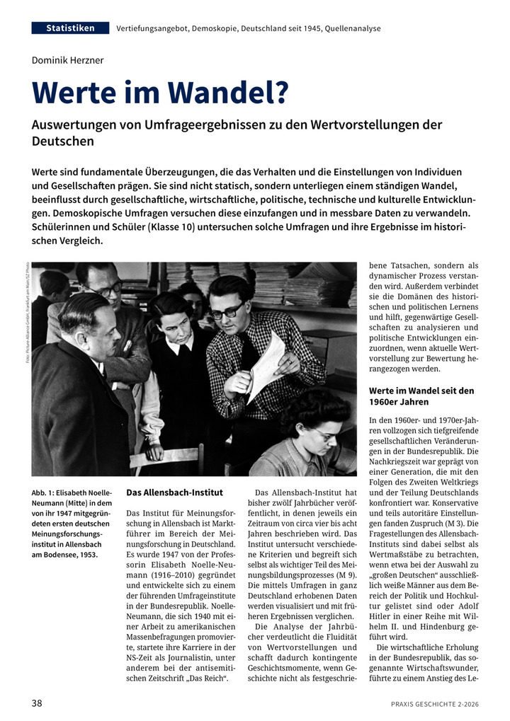 Werte sind fundamentale Überzeugungen, die das Verhalten und die Einstellungen von Individuen und Gesellschaften prägen. Sie sind nicht statisch, sondern unterliegen einem ständigen Wandel, beeinflusst durch gesellschaftliche, wirtschaftliche, politische, technische und kulturelle Entwicklungen. Demoskopische Umfragen versuchen diese einzufangen und in messbare Daten zu verwandeln. Schülerinnen und Schüler (Klasse 10) untersuchen solche Umfragen und ihre Ergebnisse im historischen Vergleich.