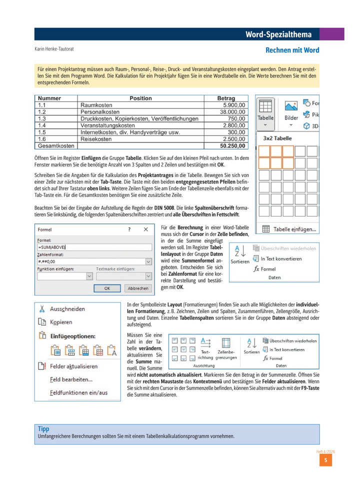 Zahlenformat, Gruppe Daten ? Summenformel, WORD-Spezialthema: Rechnen mit Word, Tabelle einfügen