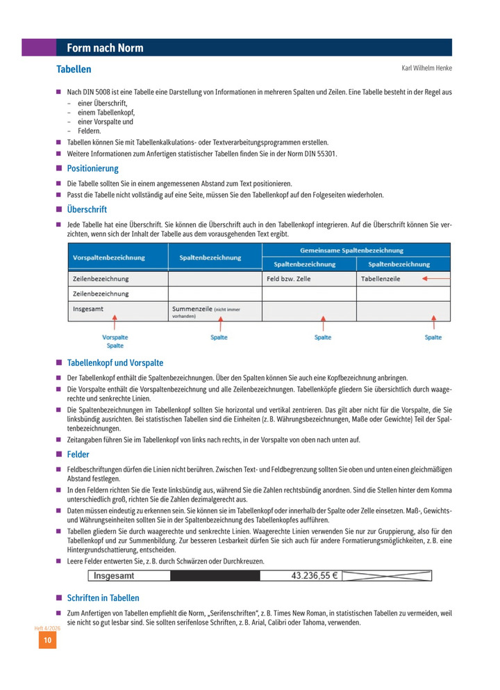 Positionierung, Schriften in Tabelle, Tabellenkopf und Vorspalte, Überschrift, Felder, Form nach Norm: Tabellen mit Zahlen