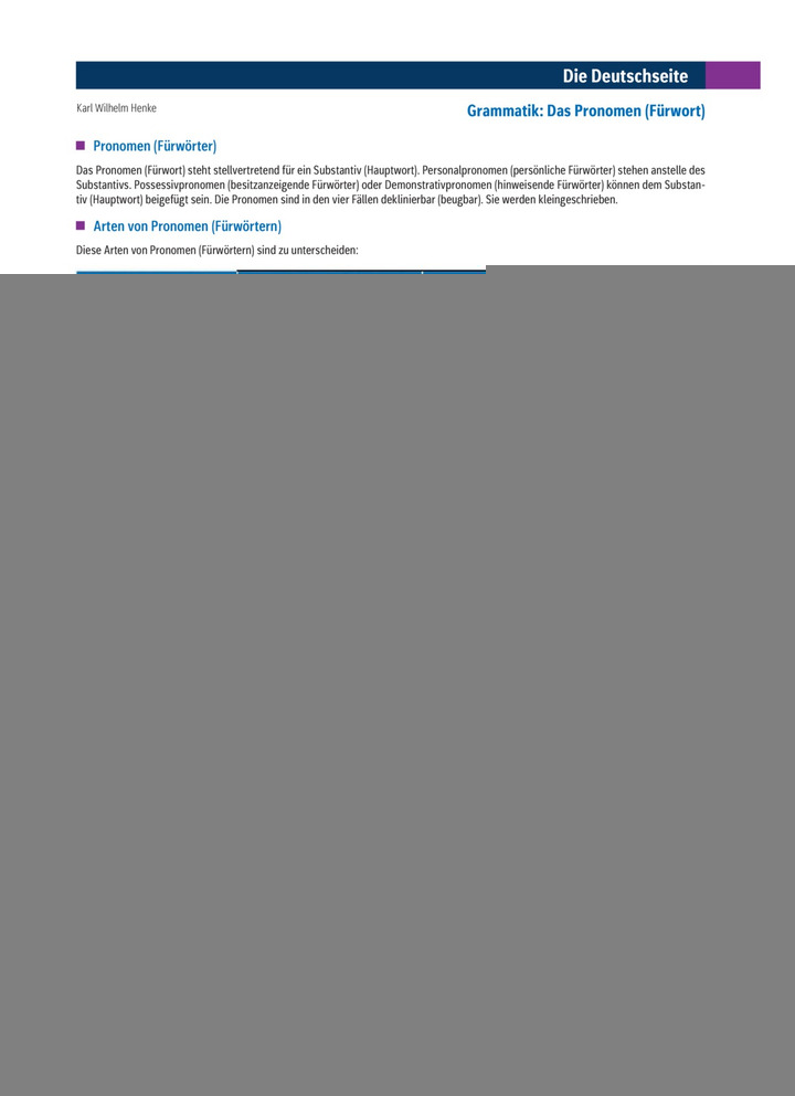 Beispiele für die Arten von Pronomen, Die Deutschseite ? Grammatik: Das Pronomen (Fürwort), Pronomen (Fürwörter), Arten von Pronomen (Fürwörtern)