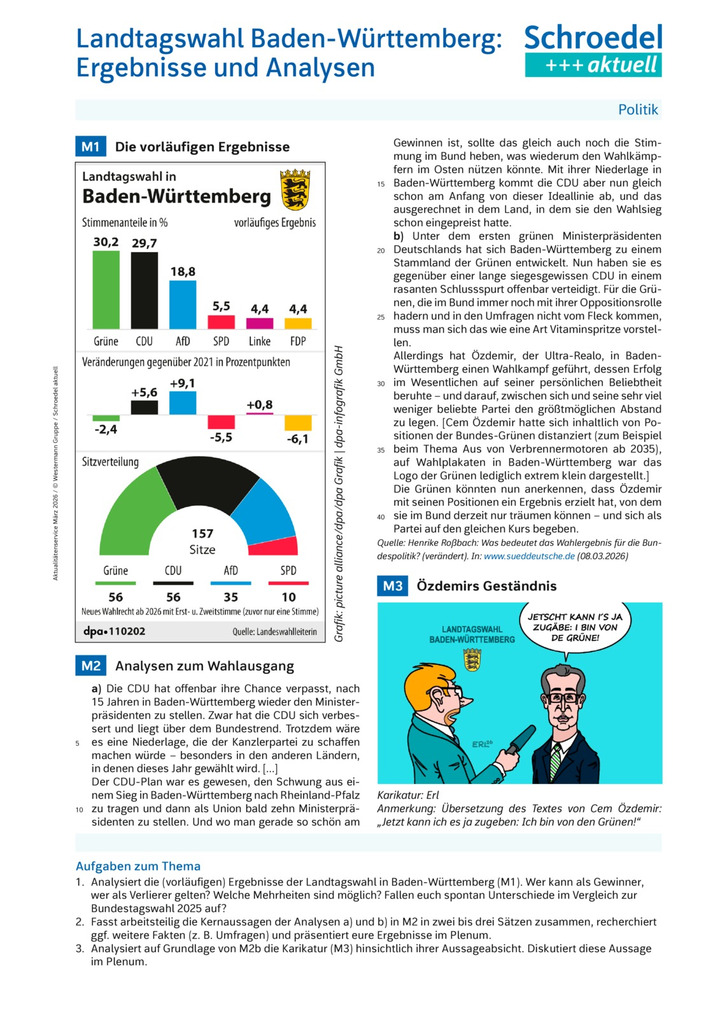 Dieses Arbeitsblatt ermöglicht eine Auseinandersetzung mit den Ergebnissen der Landtagswahl in Baden-Württemberg am 8. März 2026. Dabei wird auch der Frage nachgegangen, welche Folgen für die Bundespolitik das Wahlergebnis haben könnte.