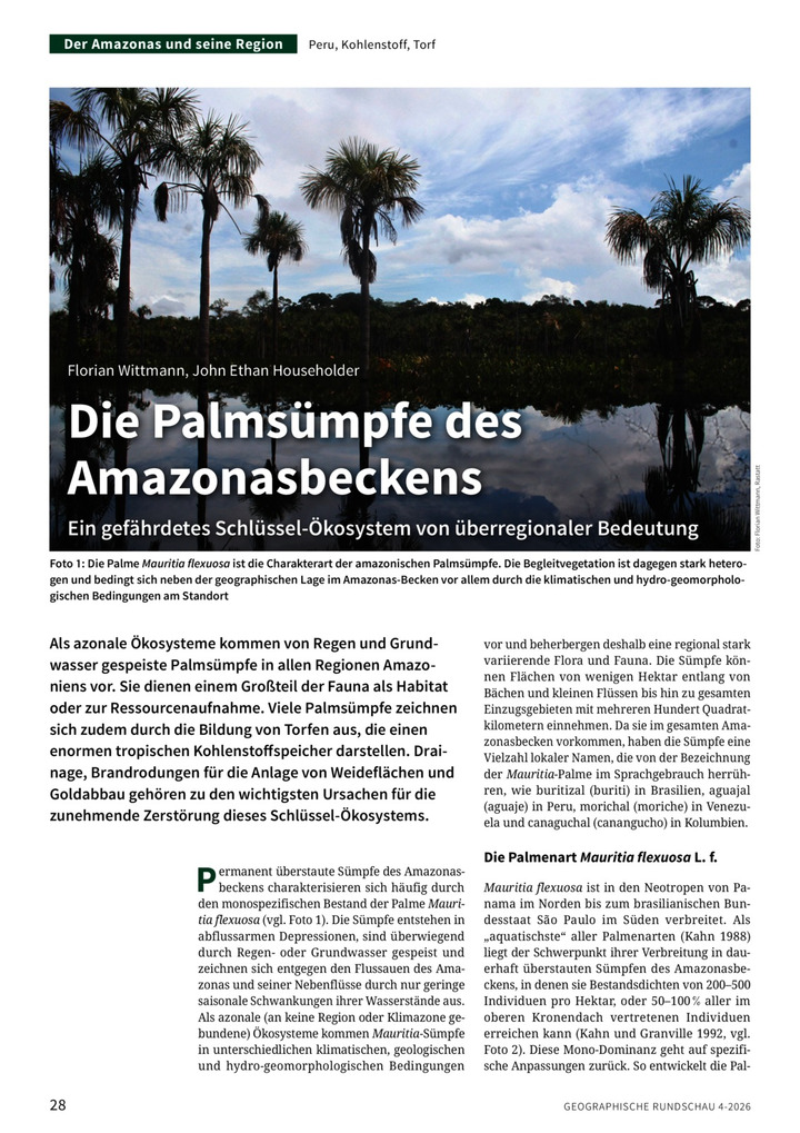Als azonale Ökosysteme kommen von Regen und Grundwasser gespeiste Palmsümpfe in allen Regionen Amazoniens vor. Sie dienen einem Großteil der Fauna als Habitat oder zur Ressourcenaufnahme. Viele Palmsümpfe zeichnen sich zudem durch die Bildung von Torfen aus, die einen enormen tropischen Kohlenstoffspeicher darstellen. Drainage, Brandrodungen für die Anlage von Weideflächen und Goldabbau gehören zu den wichtigsten Ursachen für die zunehmende Zerstörung dieses Schlüssel-Ökosystems.