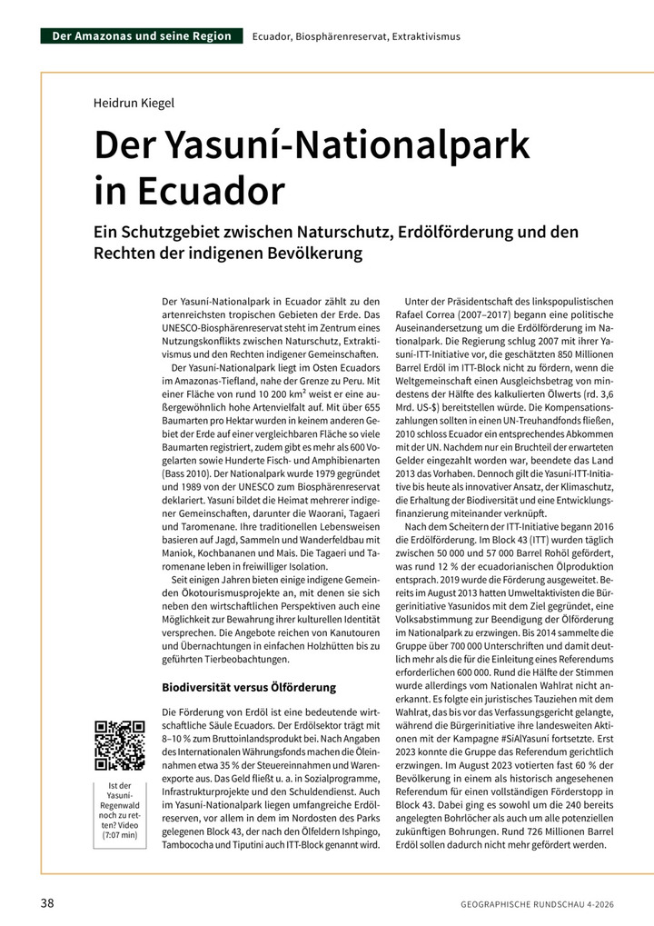 Der Yasuní-Nationalpark in Ecuador zählt zu den artenreichsten tropischen Gebieten der Erde. Das UNESCO-Biosphärenreservat steht im Zentrum eines Nutzungskonflikts zwischen Naturschutz, Extraktivismus und den Rechten indigener Gemeinschaften. Seit einigen Jahren bieten einige indigene Gemeinden Ökotourismusprojekte an, mit denen sie sich neben den wirtschaftlichen Perspektiven auch eine Möglichkeit zur Bewahrung ihrer kulturellen Identität versprechen.