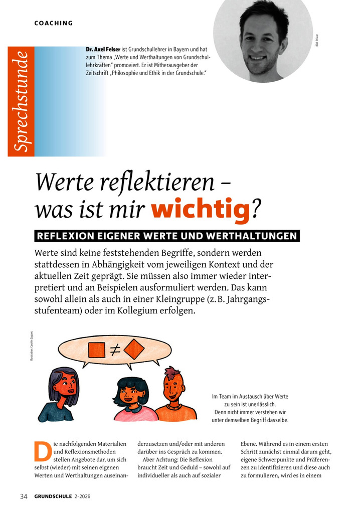 Werte sind keine feststehenden Begriffe, sondern werden stattdessen in Abhängigkeit vom jeweiligen Kontext und der aktuellen Zeit geprägt. Sie müssen also immer wieder interpretiert und an Beispielen ausformuliert werden. Das kann sowohl allein als auch in einer Kleingruppe (z. B. Jahrgangsstufenteam) oder im Kollegium erfolgen.