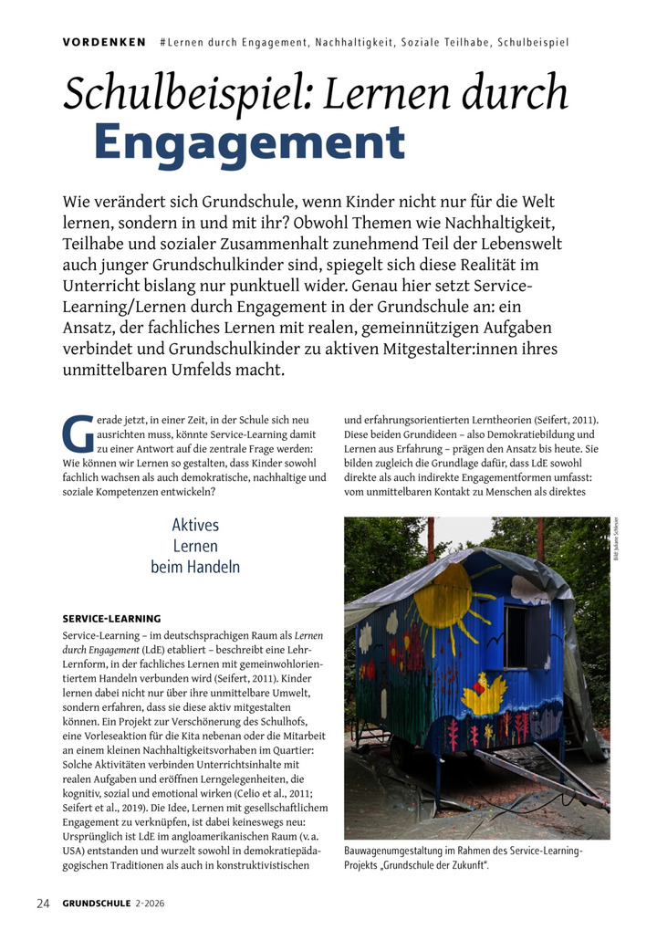 Teilhabe und sozialer Zusammenhalt zunehmend Teil der Lebenswelt auch junger Grundschulkinder sind, spiegelt sich diese Realität im Unterricht bislang nur punktuell wider. Genau hier setzt Service-Learning/Lernen durch Engagement in der Grundschule an: ein Ansatz, der fachliches Lernen mit realen, gemeinnützigen Aufgaben verbindet und Grundschulkinder zu aktiven Mitgestalter:innen ihres unmittelbaren Umfelds macht.