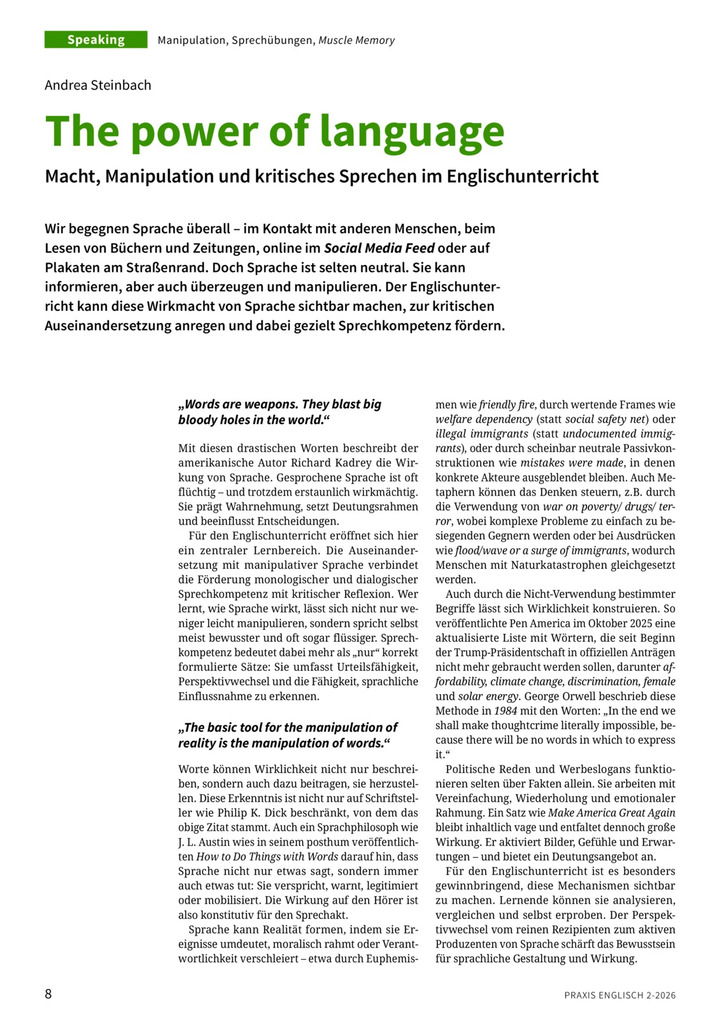Wir begegnen Sprache überall – im Kontakt mit anderen Menschen, beim Lesen von Büchern und Zeitungen, online im Social Media Feed oder auf Plakaten am Straßenrand. Doch Sprache ist selten neutral. Sie kann informieren, aber auch überzeugen und manipulieren. Der Englischunterricht kann diese Wirkmacht von Sprache sichtbar machen, zur kritischen Auseinandersetzung anregen und dabei gezielt Sprechkompetenz fördern.