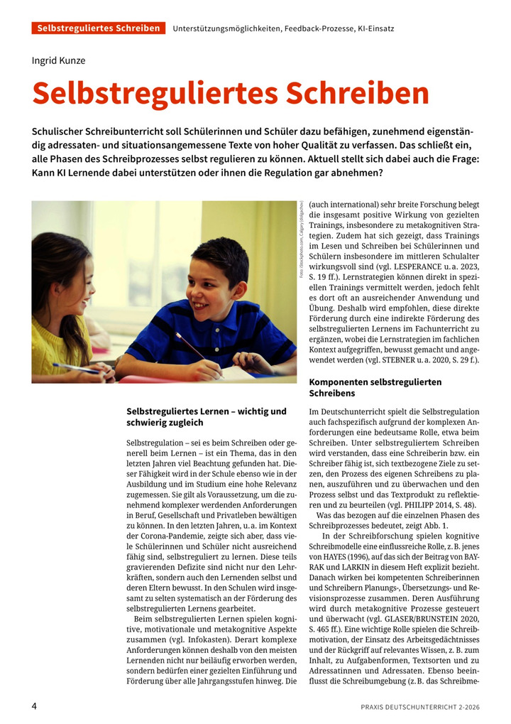 Schulischer Schreibunterricht soll Schülerinnen und Schüler dazu befähigen, zunehmend eigenständig adressaten- und situationsangemessene Texte von hoher Qualität zu verfassen. Das schließt ein, alle Phasen des Schreibprozesses selbst regulieren zu können. Aktuell stellt sich dabei auch die Frage: Kann KI Lernende dabei unterstützen oder ihnen die Regulation gar abnehmen?
