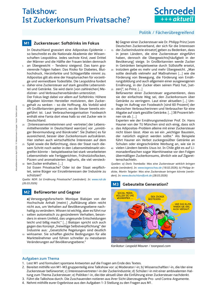 Das Arbeitsblatt greift die aktuell erneut diskutierte Forderung zur Einführung einer Zuckersteuer auf und ermöglicht eine mehrperspektivische Auseinandersetzung im Rahmen einer Talkshow.