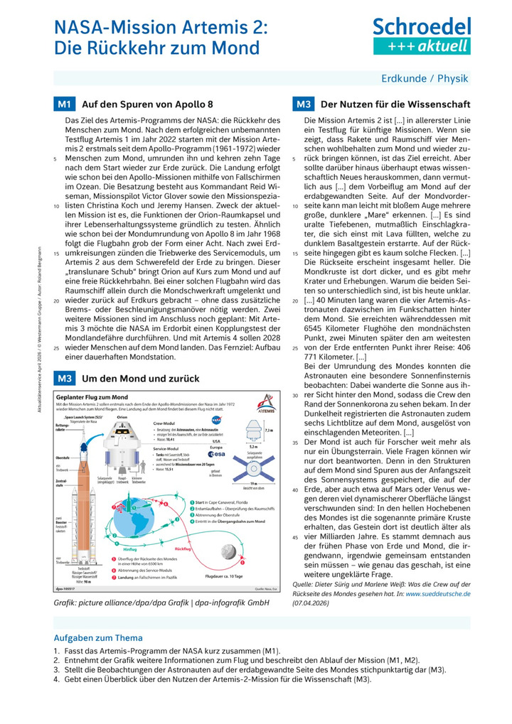 Anlässlich des erfolgreichen Flugs von Artemis 2 um den Mond beschäftigt sich dieses Arbeitsblatt mit Ziel und Zweck dieser Mondmission der NASA sowie ihrem möglichen Nutzen für die Wissenschaft.