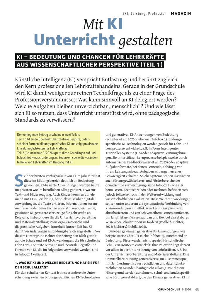 Künstliche Intelligenz (KI) verspricht Entlastung und berührt zugleich den Kern professionellen Lehrkräftehandelns. Gerade in der Grundschule wird KI damit weniger zur reinen Technikfrage als zu einer Frage des Professionsverständnisses: Was kann sinnvoll an KI delegiert werden? Welche Aufgaben bleiben unverzichtbar „menschlich“? Und wie lässt sich KI so nutzen, dass Unterricht unterstützt wird, ohne pädagogische Standards zu verwässern?