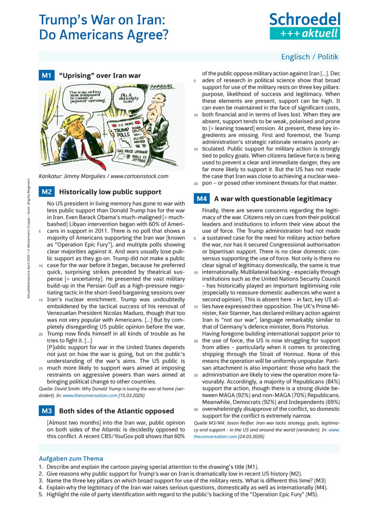 Students learn about the reasons for the low level of support for the Iran war. They focus on the arguments why the legitimacy of the military operation "Epic Fury" is seriously under question, domestically as well as internationally.