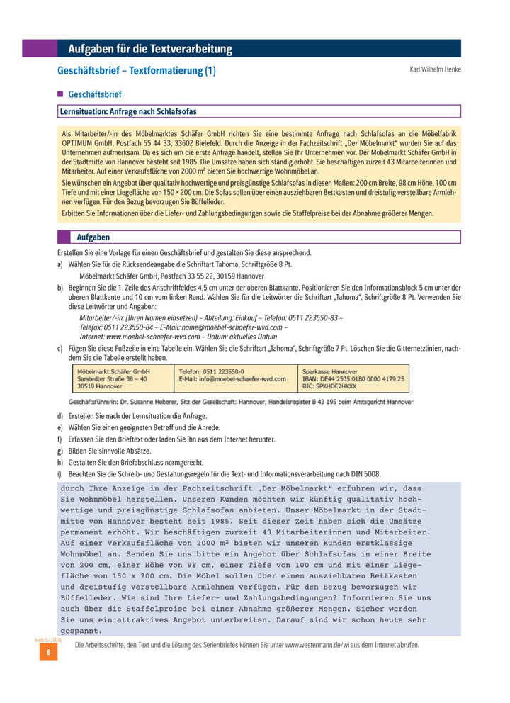 | Schlagworte | Blocksatz, Text in Spalten, Einfügen der Fußzeile, Lernsituation - Anfrage nach Schlafsofas, Gestaltung des Geschäftsbriefes nach DIN 5008, Textrahmen und Hintergrundschattierung, Aufgaben für die Textverarbeitung - Textformatierung, Randeinstellung, Schriftart und -größe, Fettschrift und Kursivschrift, Aufgaben für die Textverarbeitung: Geschäftsbrief, Silbentrennung, Erstellen einer Vorlage für einen Geschäftsbrief mit einem gestalteten Informationsblock, Fotos einfügen |