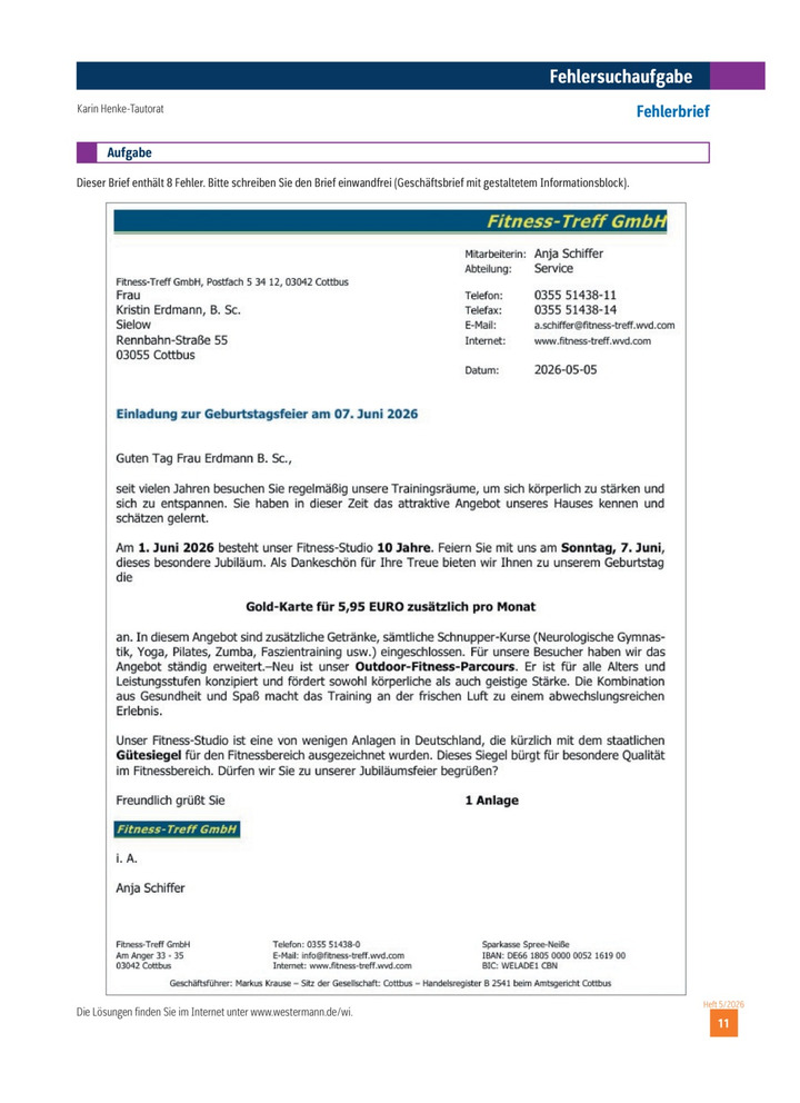 Fehlerbrief, Fehlersuchaufgabe in einem Geschäftsbrief, Suchen von Verstößen gegen DIN 5008 und sonstigen Fehlern