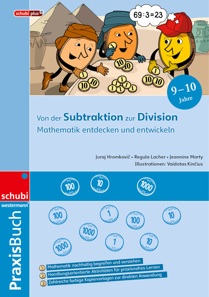 Der fünfte Band widmet sich der Division. Hier zeigen sich die grossen Vorteile des Entwickelns vom Konkreten zum Abstrakten sowohl in der Zahldarstellung als auch bei der Ausführung der arithmetischen Operationen. Zunächst lernen die Kinder durch wiederholte Subtraktion die Division auszuführen. Anhand des anschaulichen fairen Aufteilens eines Schatzes unter mehreren Personen, entwickeln die Kinder selbständig den Divisionsalgorithmus in der Münzdarstellung von Zahlen. Danach gestalten die Kinder in kleinen Schritten immer abstraktere Beschreibungen des Divisionsprozessen mit, bis sie zur schriftlichen Division im dezimalen Stellenwertsystem gelangen.