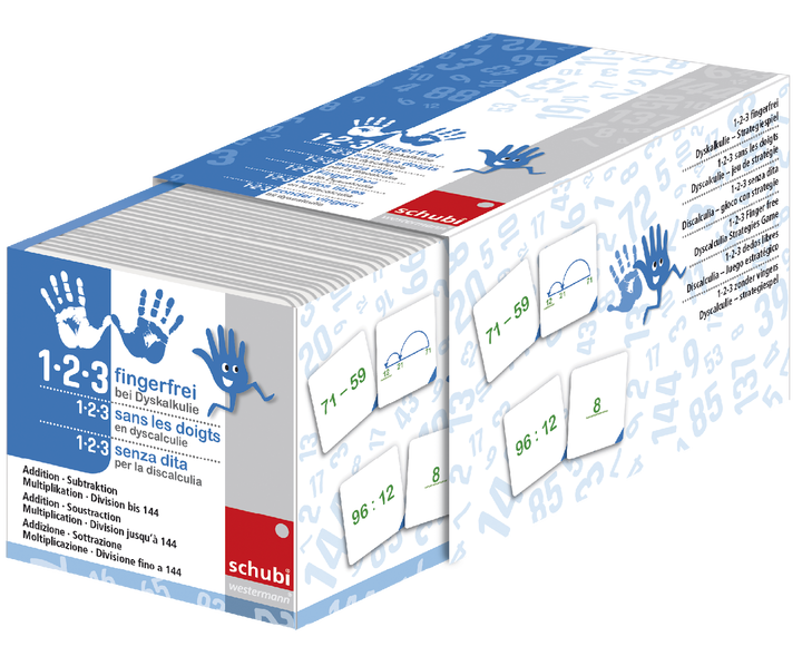 Die Memo-Spiel-Reihe ‚1-2-3 fingerfrei‘ mit Strategiespielen zur Dyskalkulie bietet Therapeutinnen und Pädagogen wichtiges Material für den gezielten Aufbau des mathematischen Basiswissens mit Hilfe von Rechenstrategien. Kinder mit Rechenschwäche werden dabei unterstützt, sich ihr mathematisches Wissen ohne Zählen anzueignen, es durch spielerisches Training zu automatisieren und zu verbessern. Die Aufgaben der fünf Schachteln können aufeinander aufbauend, aber auch unabhängig voneinander eingesetzt werden. Jede Box als stabile Schiebeschachtel.
