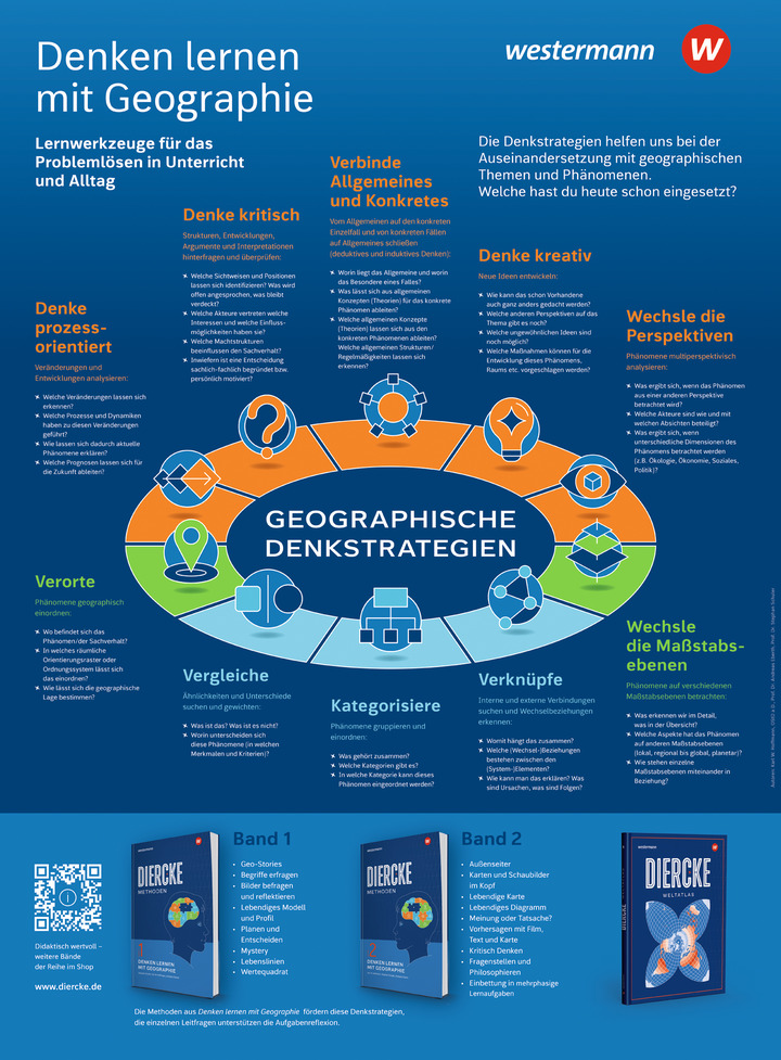 Das Lernplakat stellt die zehn grundlegenden geographischen Denkstrategien der Diercke Denken lernen-Bände anhand klar strukturierter Icons und kurzer Beschreibungen übersichtlich dar. Es eignet sich zur Unterstützung des Unterrichts und zur Visualisierung zentraler Arbeitsweisen der Geographie.