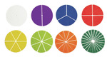 - 1 Set Bruch-Teile (1/1 weiß: 1 Stück, 1/2 violett: 2 Stück, 1/3 blau: 3 Stück, 1/4 rot: 4 Stück, 1/6 gelb: 6 Stück, 1/8 hellgrün: 8 Stück, 1/12 orange: 12 Stück, 1/24 dunkelgrün: 24 Stück)