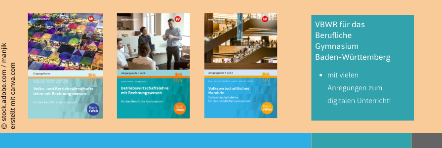 VBWR für das Berufliche Gymnasium in BaWü bietet außerdem einen umfangreichen Pool an Aufgaben, die sich zur Erarbeitung und Anwendung des prozeduralen und deklarativen Wissens eignen. Die Aufgaben verbinden Aufträge zur Informationsbeschaffung, der kritischen Auseinandersetzung mit unterschiedlichen Positionen und Zielkonflikten sowie der Erarbeitung von Lösungsansätzen für übergreifende Problemstellungen. Dabei werden nicht nur die fachlichen und methodischen Kompetenzen gestärkt: Die Spannweite der Arbeitsaufträge bietet genug Anlässe, verschiedene Arbeits- und Sozialformen anzuwenden, Handlungsergebnisse aufzubereiten und zu präsentieren. So werden auch die persönlichen und sozialen Kompetenzen gefördert.