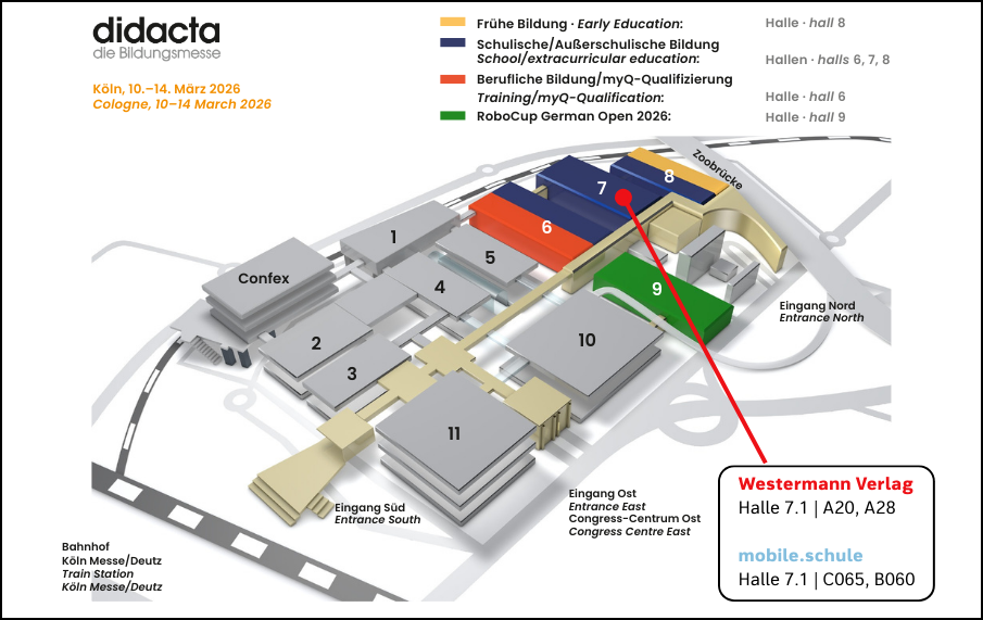 Die didacta findet vom 10. bis 14. März 2026 in Köln statt. Unsere Stände finden Sie hier: