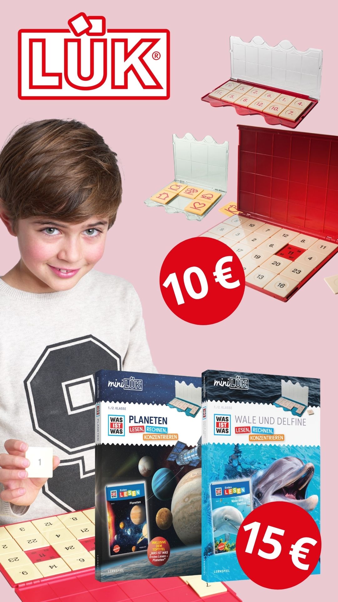 Sichern Sie sich unsere Messeangebote: Alle drei LÜK-Kästen – bambinoLÜK, miniLÜK und LÜK – erhalten Sie für nur 10 € pro Stück. Die WAS-IST-WAS-Sets „Planeten“ und „Wale und Delfine“ bieten wir zum Messerabatt von 15 € statt 26,95 € an. Enthalten sind ein blaues miniLÜK-Kontrollgerät, ein Übungsheft sowie ein passendes WAS IST WAS-Buch „Erstes Lesen“.