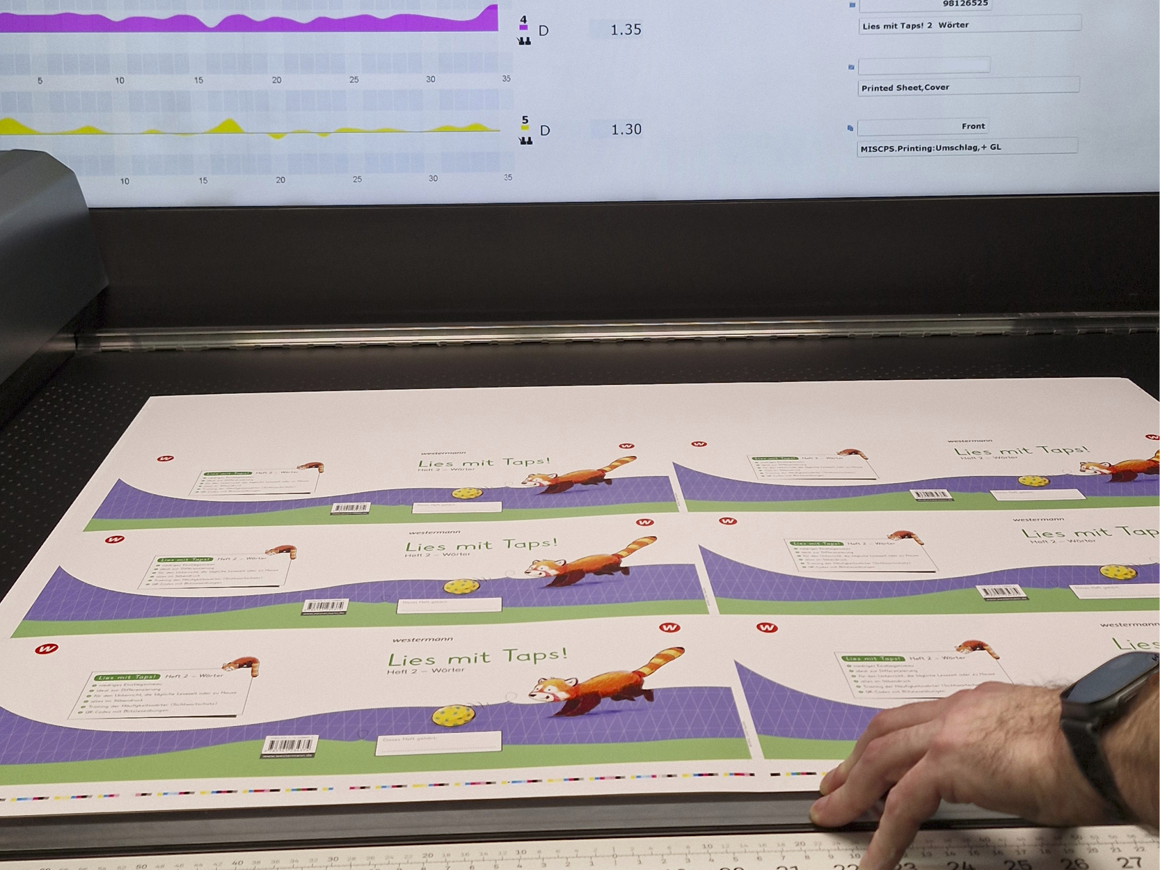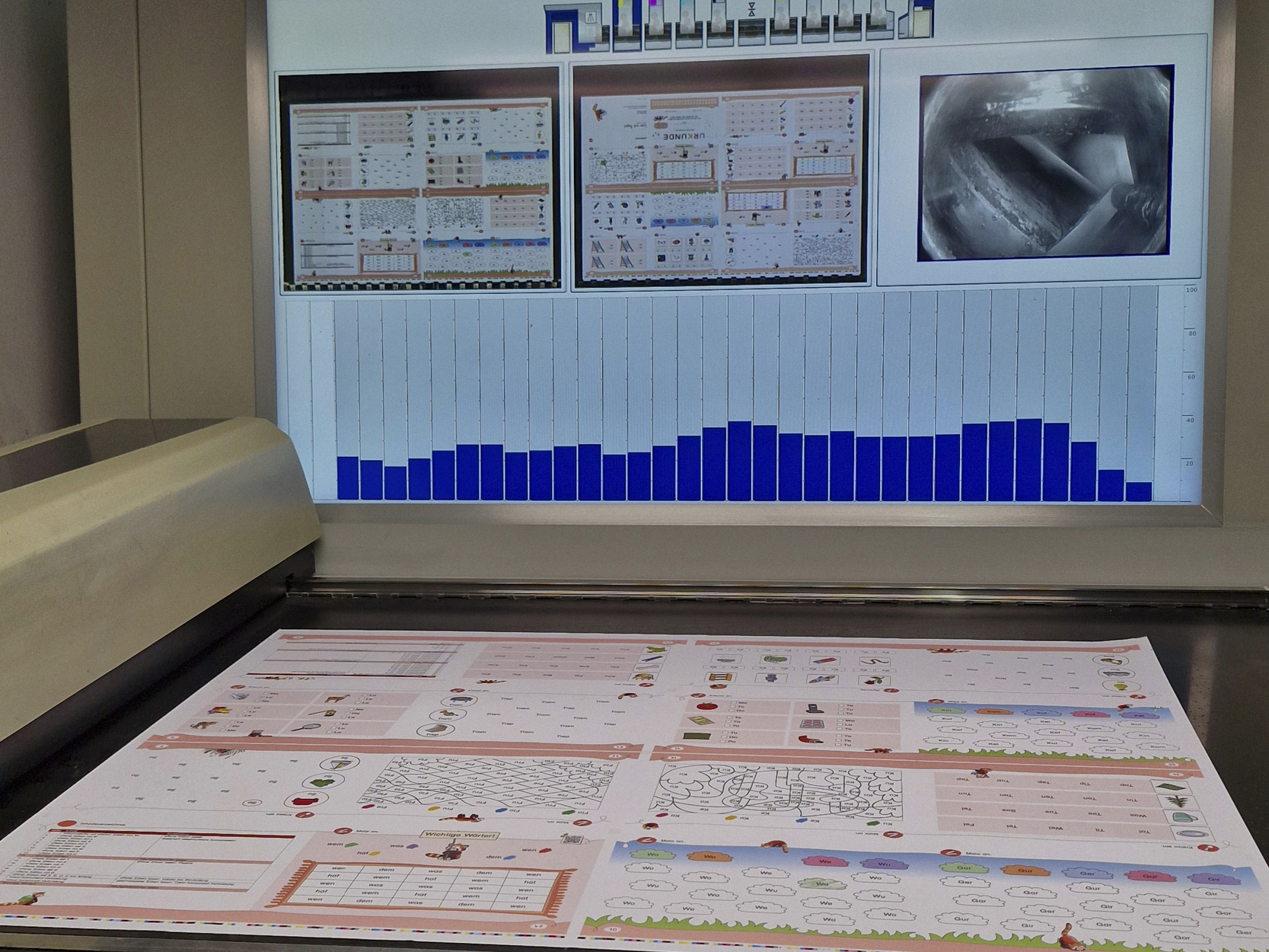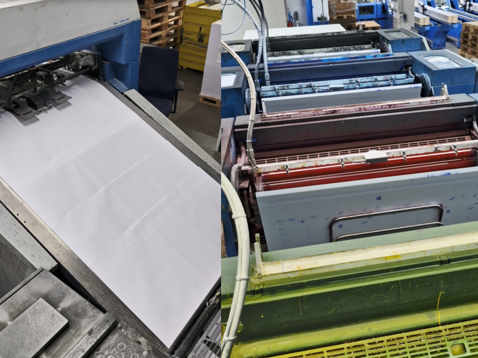 Was am anderen Ende aus der Maschine herauskommt, ist ein fertiger Druckbogen, doppelseitig bedruckt. Dieser durchläuft dann noch eine Qualitätskontrolle. Dabei wird geprüft, ob die Farben alle korrekt dargestellt sind, ob alles am richtigen Platz ist und so aussieht, wie in der digitalen Vorlage.