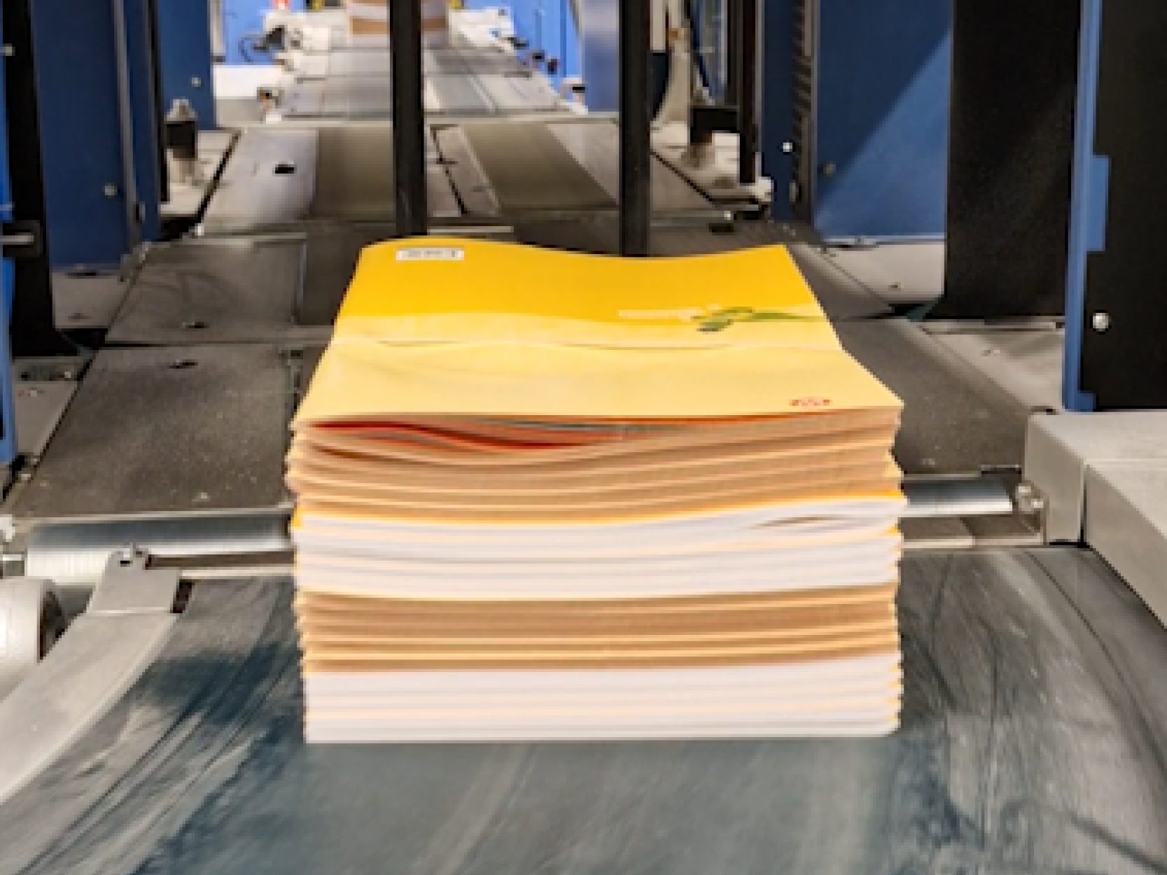 Die Hefte sind fertiggestellt. Damit sie nun vernünftig ausgeliefert werden können und dabei gut geschützt sind, werden sie noch zu je 20 Stück zusammengefügt und eingeschweißt.