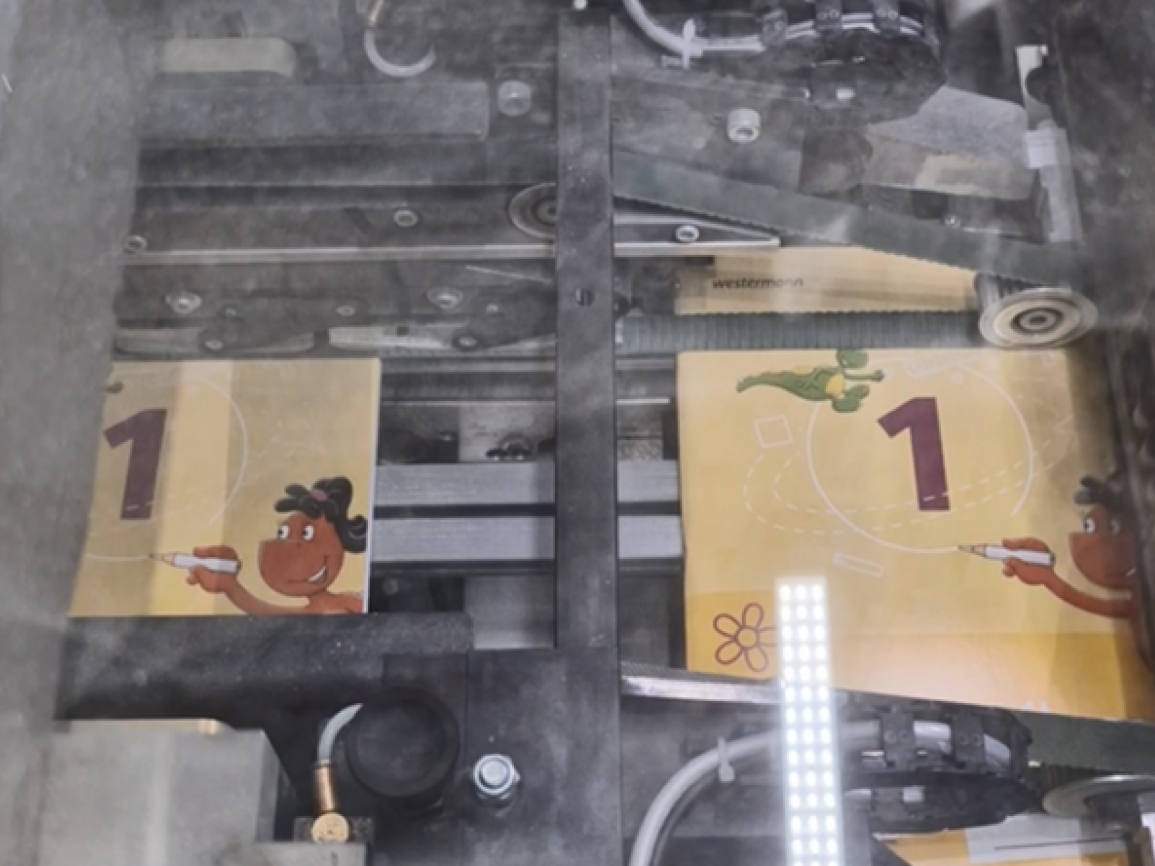 Nachdem die Heftseiten für "Lies mit Taps!" den Druck durchlaufen haben, liegen uns Druckbögen á 32 Seiten vor. Aber die lassen sich natürlich noch nicht im Unterricht einsetzen. Um damit weiter arbeiten zu können, geht es nun zur Falzmaschine. Da Taps noch im Druck ist, schauen wir uns den Prozess anhand anderer Hefte an: