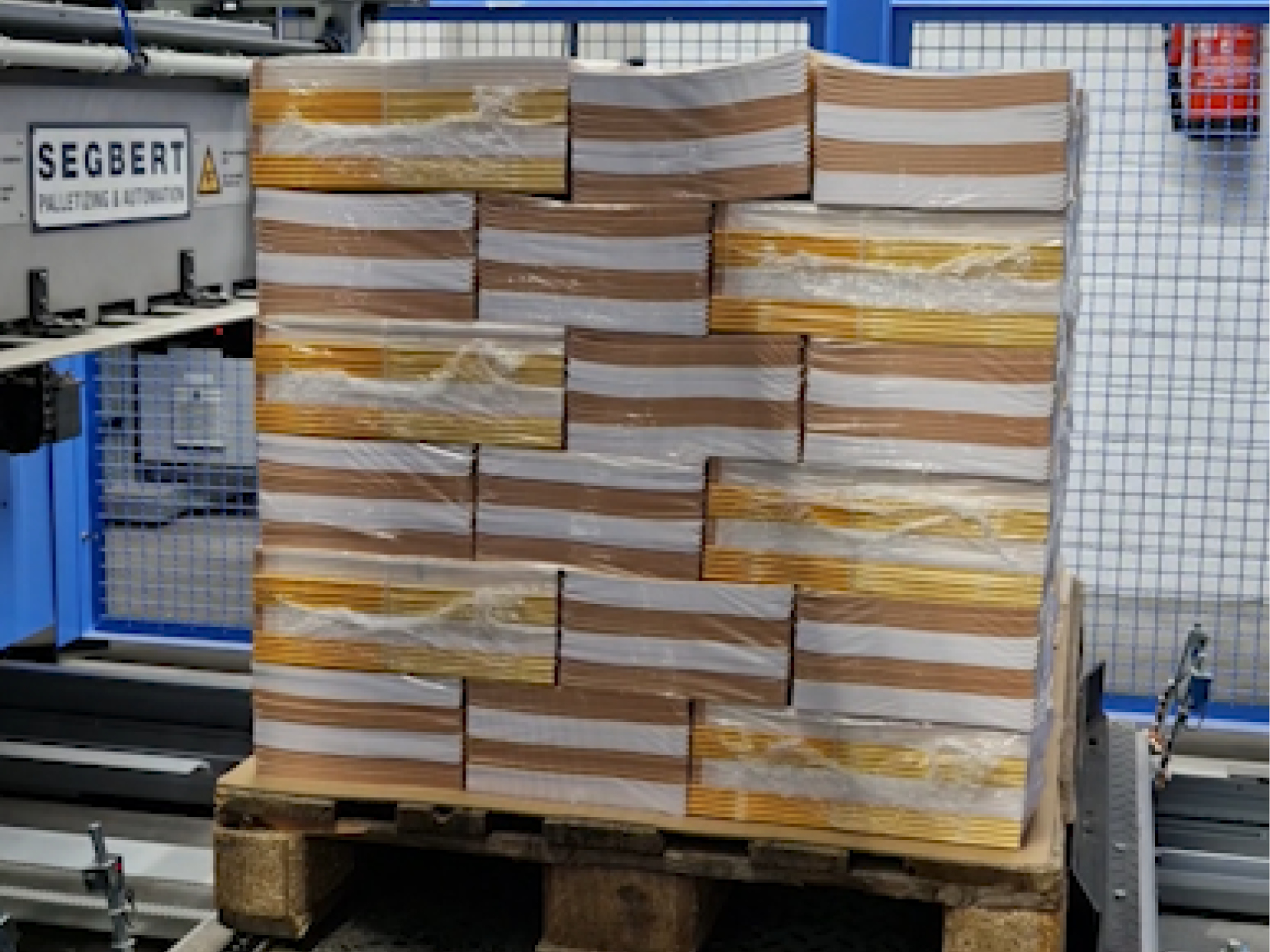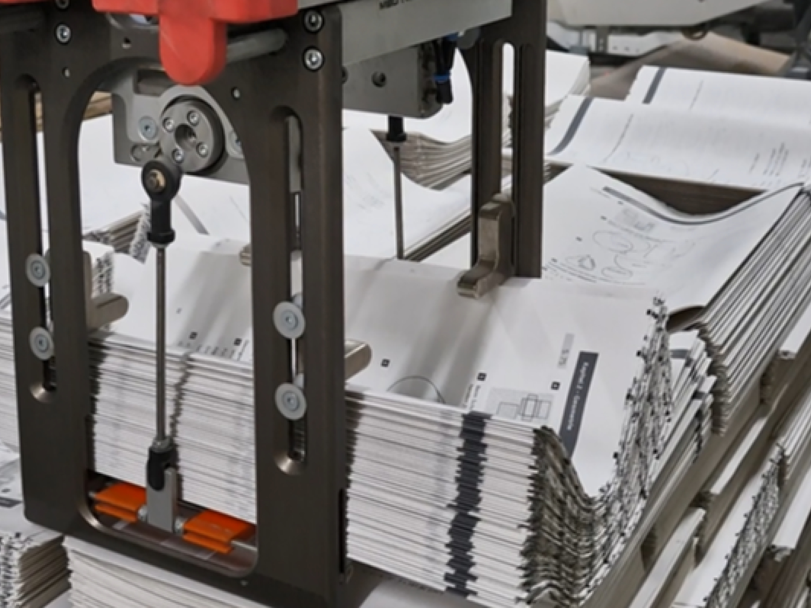Auch hier durchlaufen die Bögen in hohem Tempo einen Prozess, bei dem sie immer weiter gefaltet werden (der Buchbinder spricht hier von "falzen") – bis sie schlussendlich im richtigen Format als ein Stapel aus der Maschine herauskommen. Ein Greifarm verlegt mehrere dieser gefalzten Druckbögen auf eine Palette. Von hier aus geht's weiter zum Hefter. Wir nähern uns dem fertigen Heft.