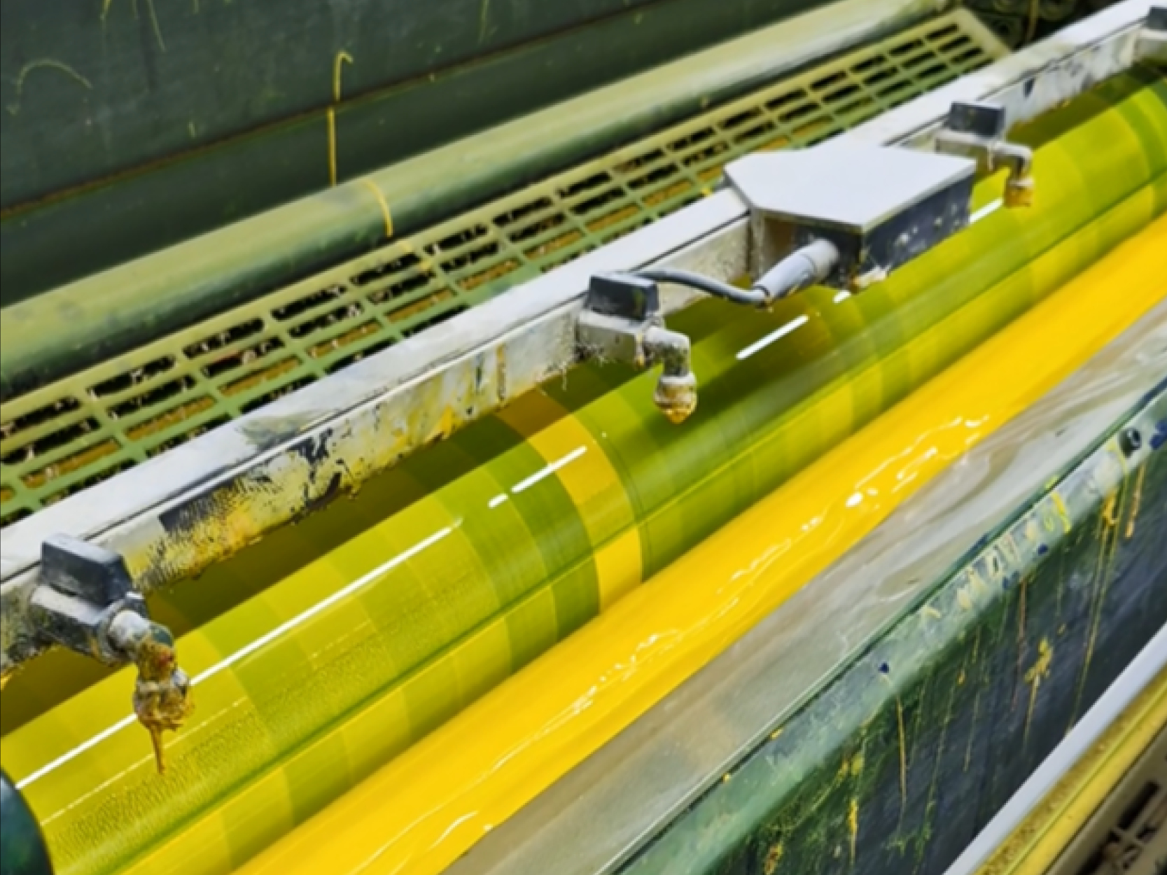 Jede belichtete Platte wird in einem Druckwerk mit der jeweiligen Farbe eingespannt. Druckbögen entsprechend der o. g. Größe werden in hohem Tempo in die Maschine gezogen und durchlaufen alle vier Druckwerke bzw. bei einer 8-Farb-Druckmaschine alle acht Druckwerke mit einer Wendung in der Maschine. Der Bogen wird nach den ersten vier Farben mechanisch umgedreht, damit die Rückseite sofort bedruckt werden kann. Der Drucker spricht hier von Schöndruck (Druck der Vorderseite) und Widerdruck (Druck der Rückseite).