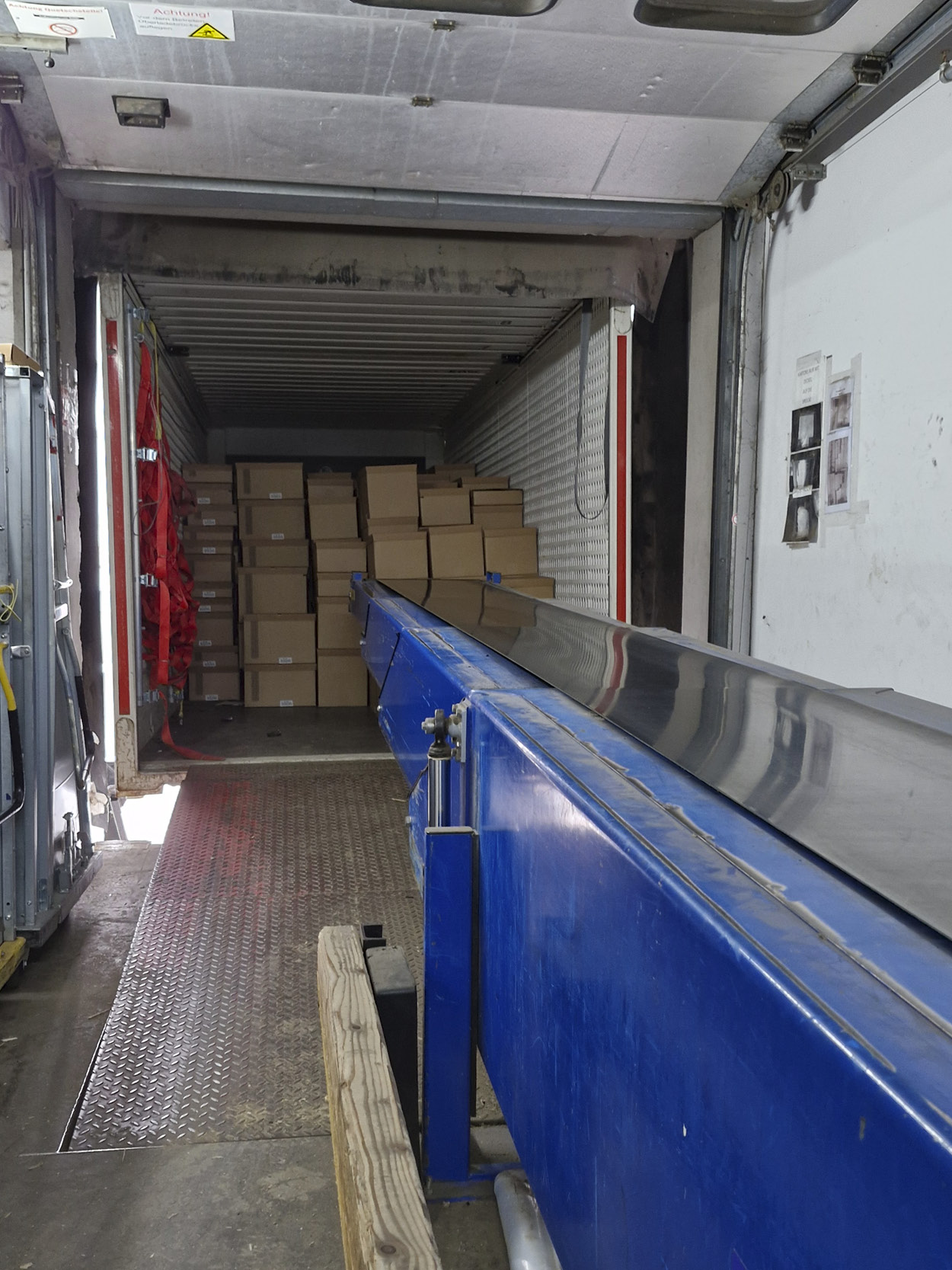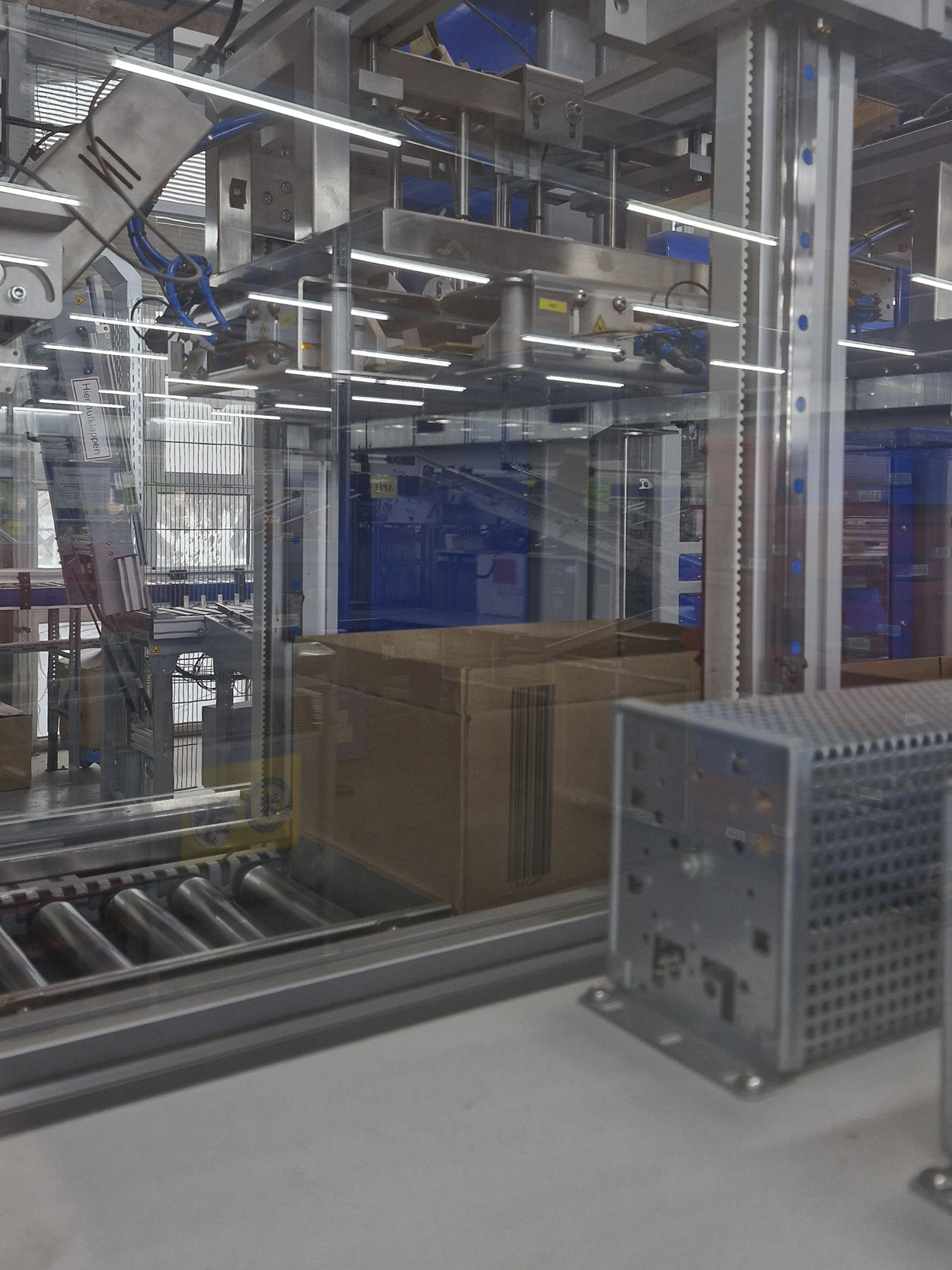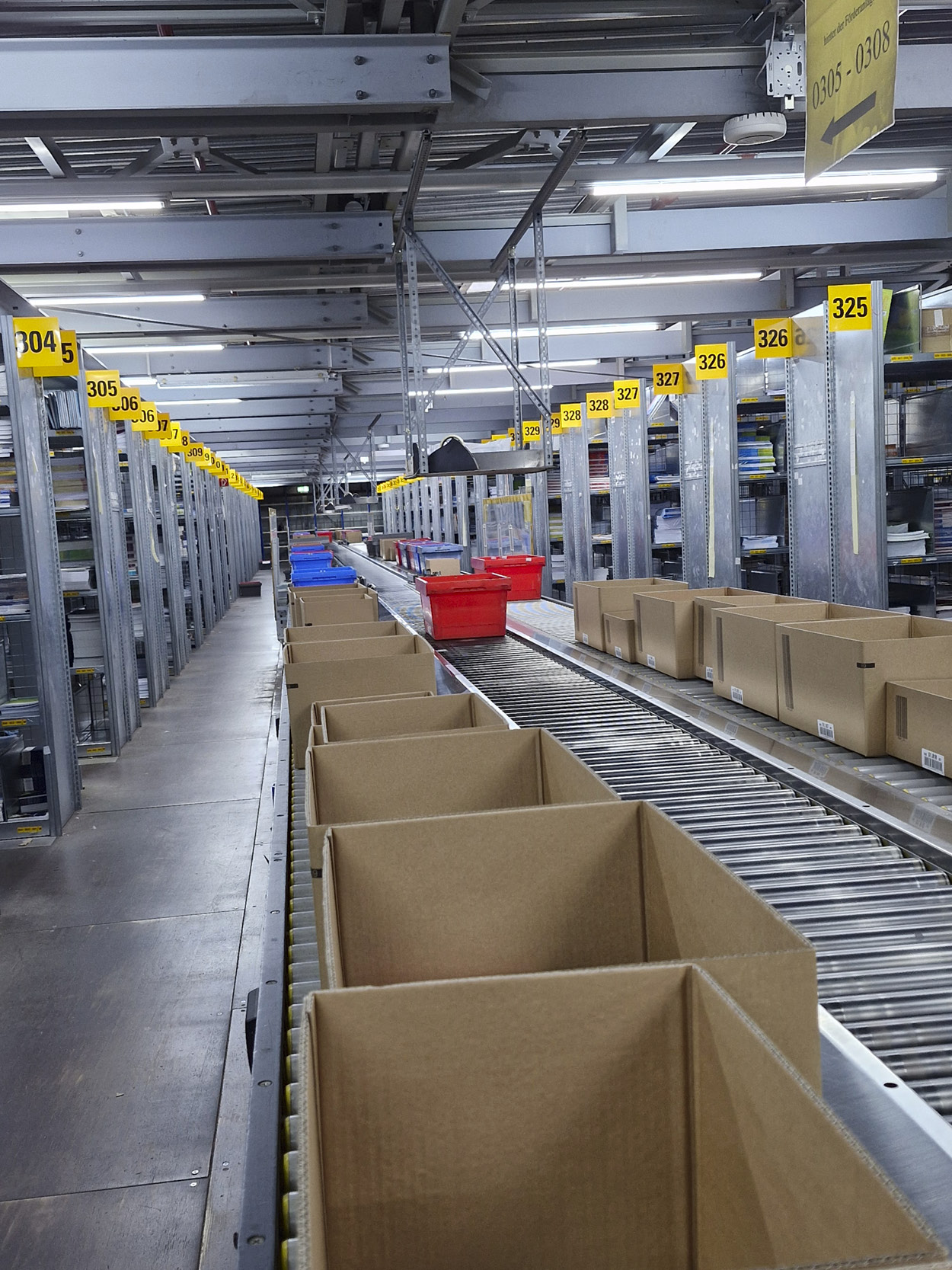 Die Kartons und Wannen werden mithilfe des Förderbandes (Mitte) bis zum richtigen Punkt befördert, dann nach links und rechts vom Band geschoben.
