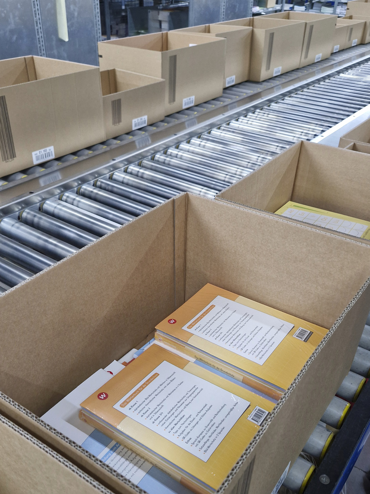 Alle benötigten Hefte werden in die Kartons gelegt. Nun durchläuft der Karton die letzten Stationen: Die Ware wird mit Füllmaterial gegen horizontales Verschieben gesichert. Eine Maschine prüft den Füllstand des Kartons und schneidet die Ecken von oben entsprechend tief ein. Diese können dann umgeknickt, der Deckel oben befestigt werden. Damit haben die Materialien auch vertikal keine Chance mehr, zu verrutschen. Der fertige Karton wird abschließend mit der Adresse beklebt, danach geht es zum Versand.