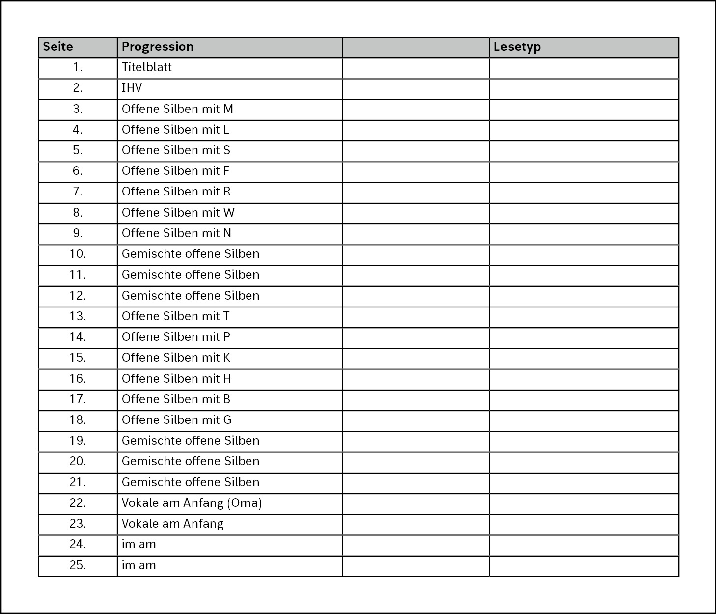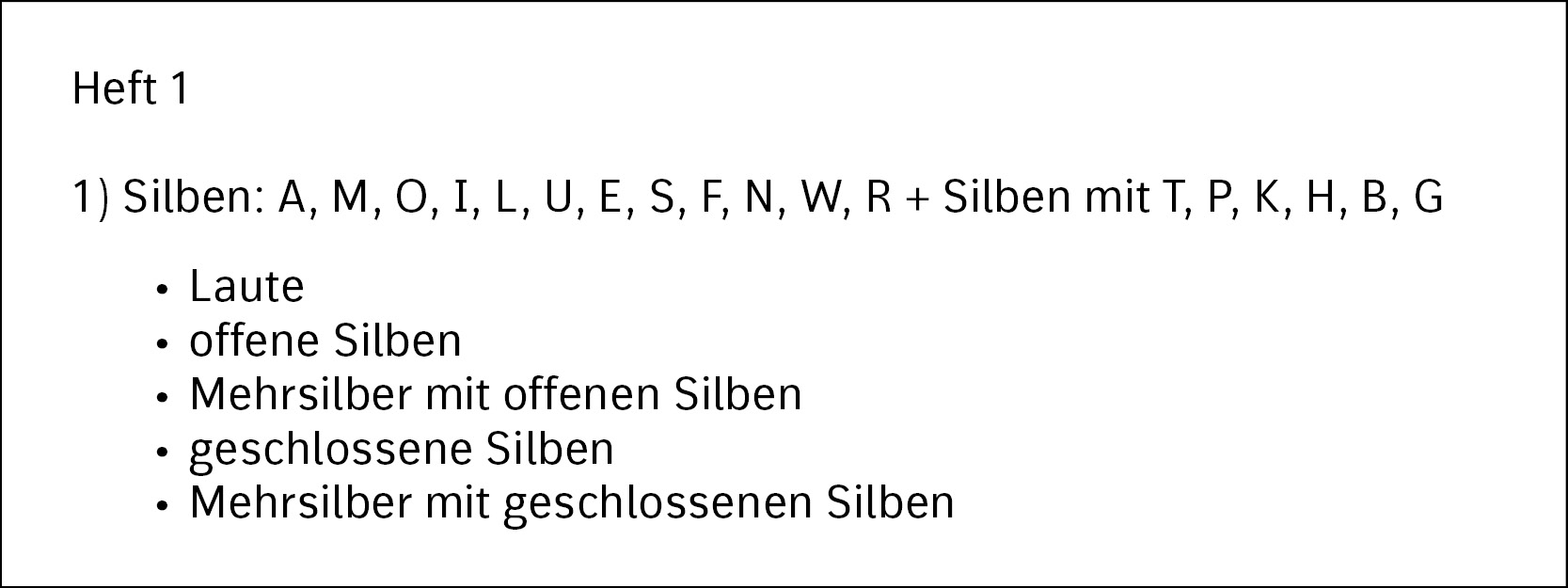 Es folgt die Erstellung von Wortsammlungen und Wörterlisten. Hierbei wird der Grundwortschatz der Bundesländer herangezogen und sichergestellt, dass die Kinder die Wörter, die auf den Seiten vorkommen, auch schon erlesen können.