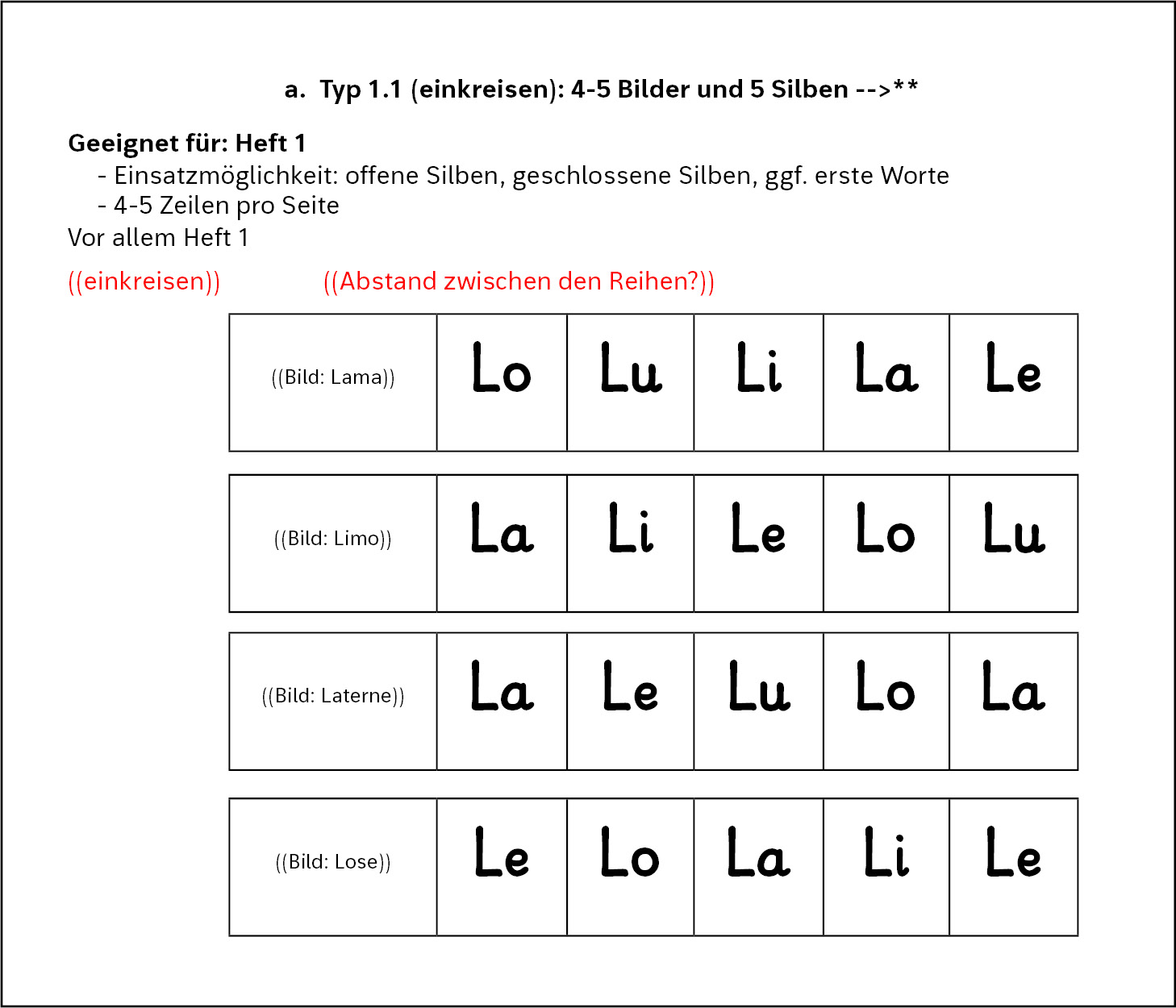 Im Anschluss geht es los mit den Ideen für die Aufgabentypen. Dabei ist wichtig, sich auf wenige abwechslungsreiche Formate zu beschränken, damit die Kinder schnell verstehen, wie die Aufgaben zu lösen sind und das Heft selbstständig bearbeiten können.