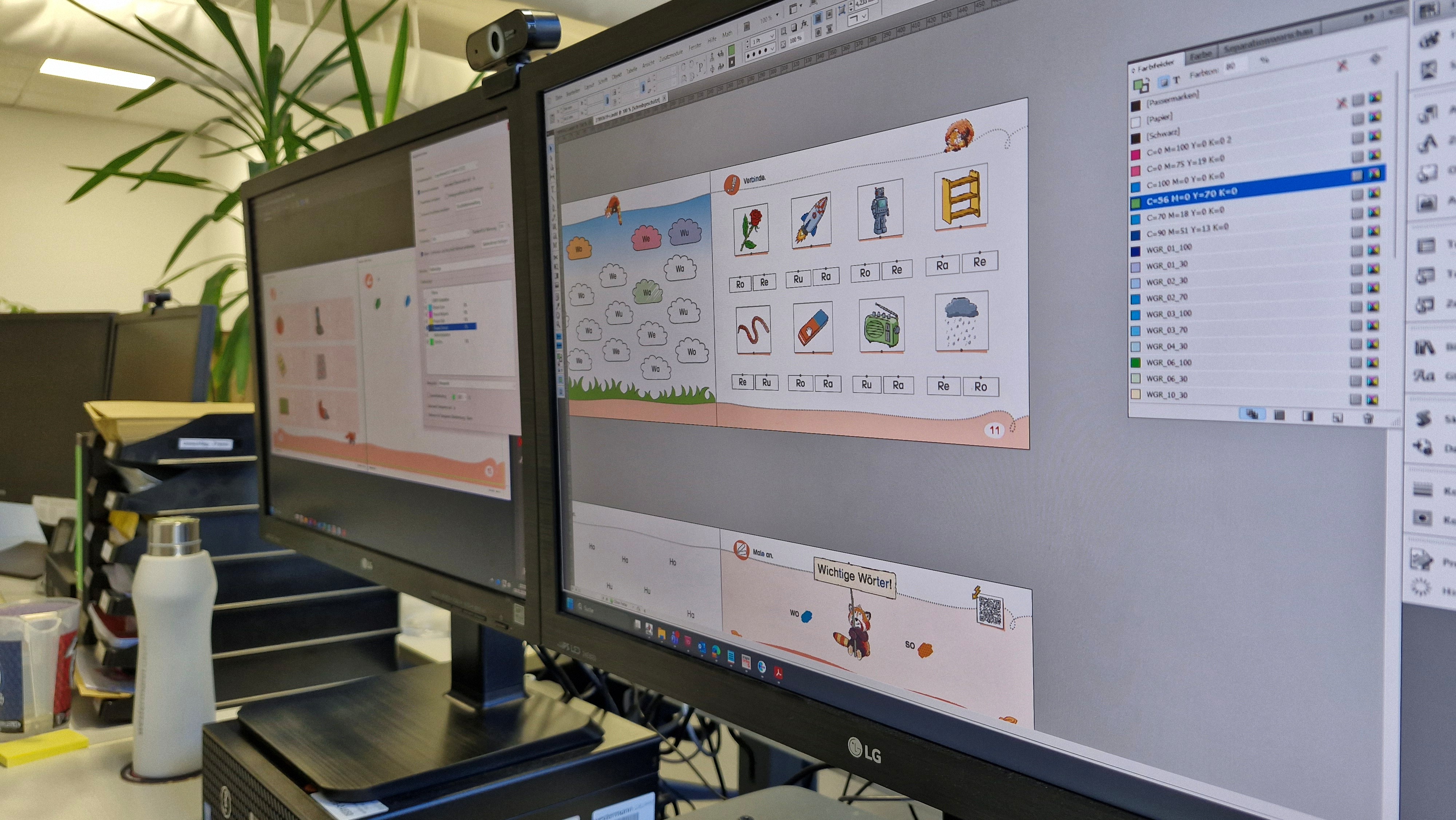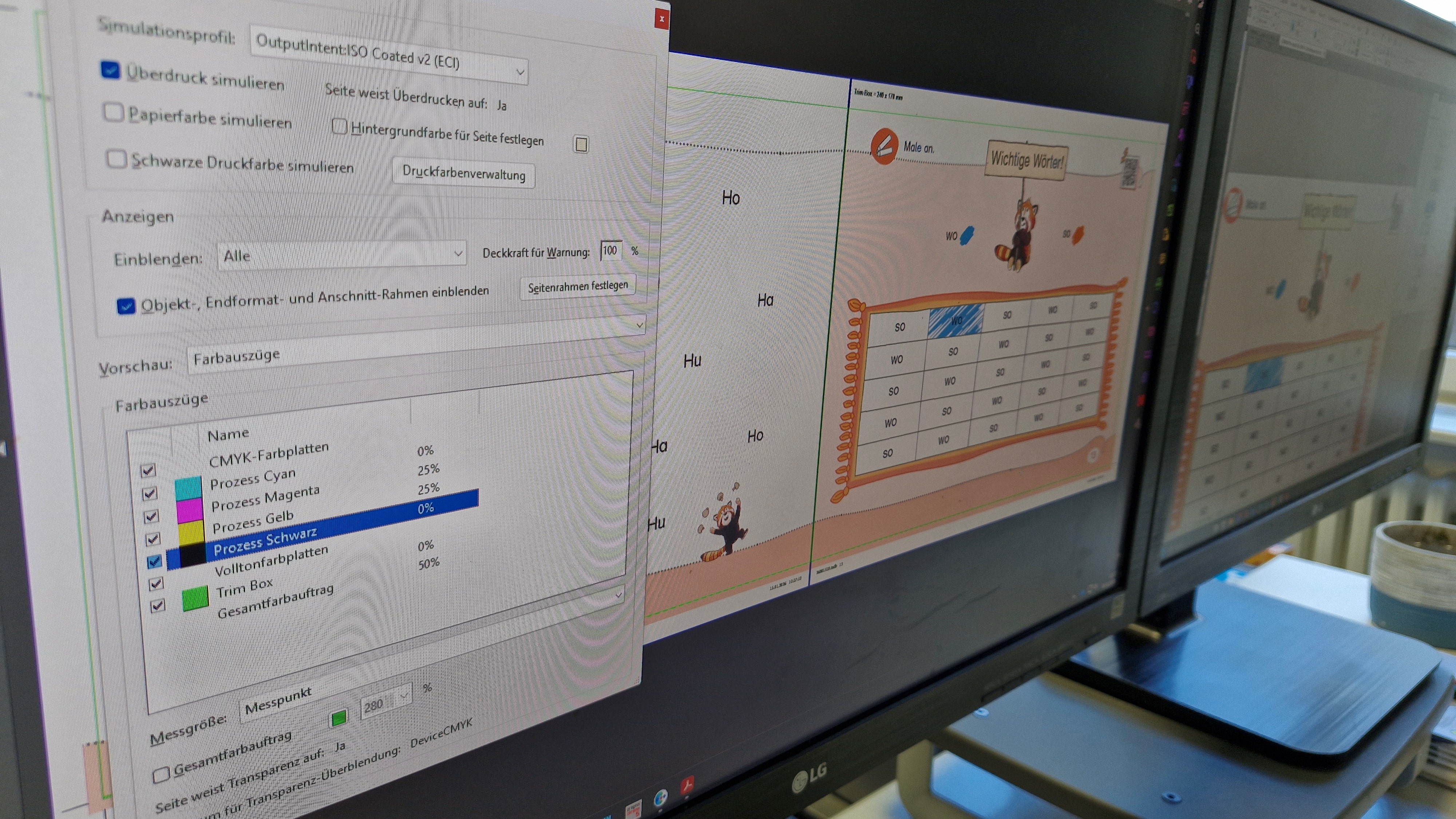 Damit die Hefte bestens auf den Druck vorbereitet sind, hat die Redakteurin Lisa sie nun an die Vorstufe weitergeleitet. Hier stehen nun verschiedene Kontrollen an, ehe die Daten Richtung Druckerei gegeben werden können. Im Mittelpunkt steht dabei die Frage: Ist alles korrekt für die Druckerei aufbereitet?Ab dem Moment, wo die Redaktion die Daten in die Vorstufe gibt, ist mit ca. 3 Tagen zu rechnen, ehe die fertigen Druckdaten von der Vorstufe zurückgeliefert werden. Das hängt vor allem damit zusammen, dass das Vorstufen-Team etwa 100-150 Titel am Tag bearbeitet. Hier wird sich nicht nur um Taps und weitere Titel aus der Grundschulredaktion gekümmert, sondern auch um alle anderen Materialien aus dem Westermann-Verlag – da kommt schon einiges zusammen. Redakteurinnen und Redakteure aus allen Bereichen bestellen hier ihre Daten – von der Kita bis zur beruflichen Bildung. Hinzu kommen Kinder- und Jugendbücher des Arena-Verlages sowie Materialien aus anderen Verlagen.