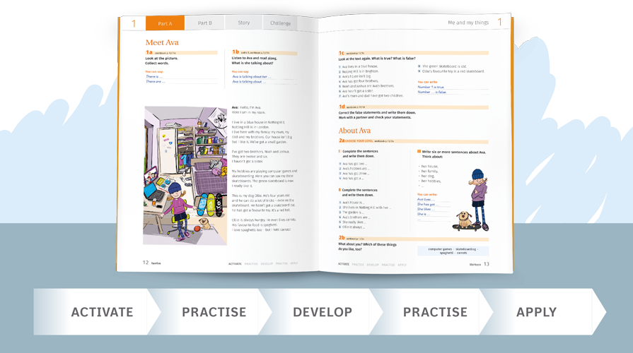 Activate: Neues wird kennengelernt und vorhandenes Wissen aktiviert. Practise: Neue sprachliche Mittel werden bewusst gemacht und eingeübt. Develop: Der neue Stoff wird erweitert und vertieft. Practise: Weitere Aufgaben bereiten gezielt auf die Target Task vor. Apply: Hier laufen die Fäden zusammen. Das Gelernte wird praktisch in der Target Task angewendet.