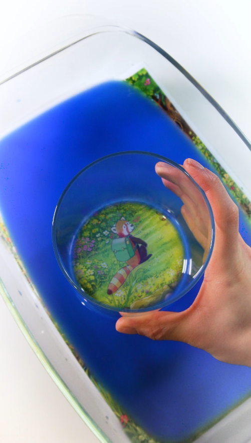 1. Legt das Suchbild unter eine Auflaufform und füllt diese mit Wasser.