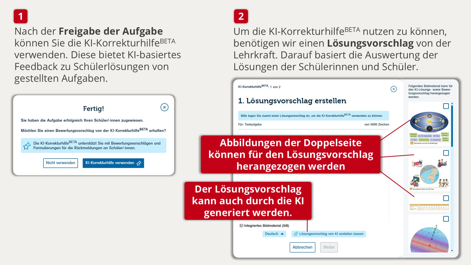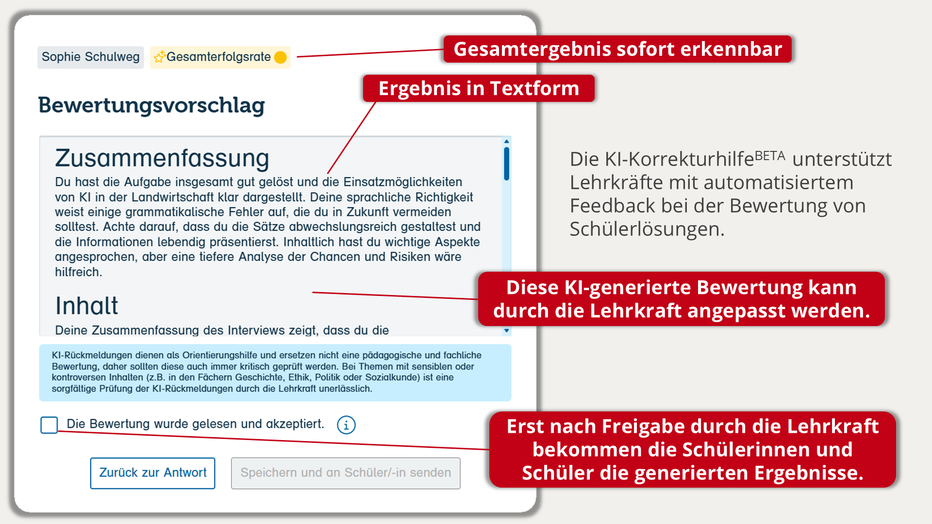 Im Video sehen Sie die KI-KorrekturhilfeBETA in der Praxis. Sie erhalten einen Eindruck, wie Vorschläge für Feedback und Bewertung erzeugt und anschließend durch die Lehrkraft geprüft werden.