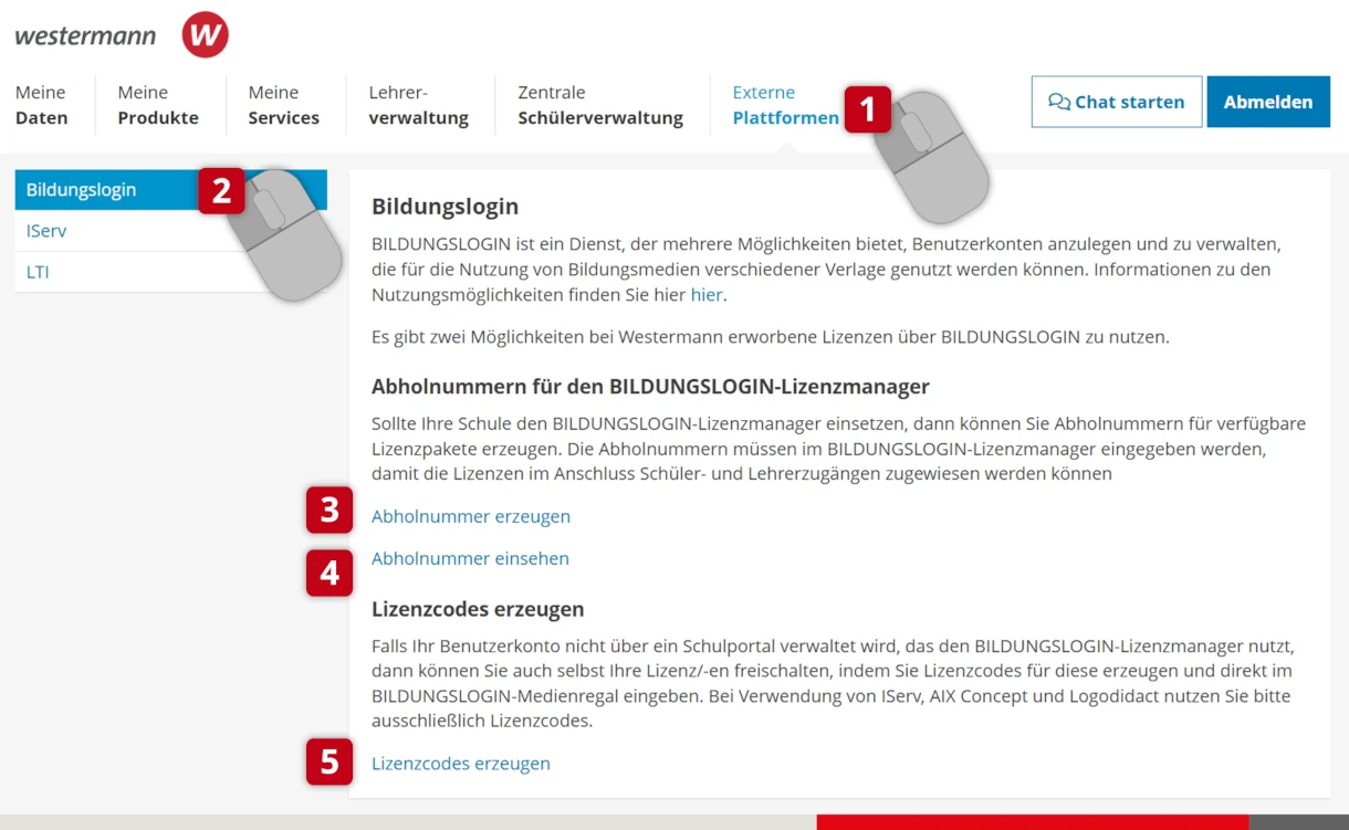 - Abholnummer erzeugen: Damit generieren Sie einen einzelnen Code, mit dem Sie zahlreiche Lizenzen auf einmal zum BILDUNGSLOGIN übertragen können.